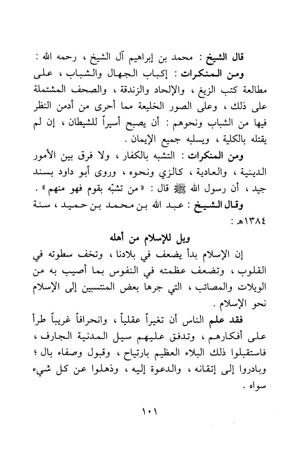 ومن المنكرات: التشبه بالكفار، ولا فرق بين الأمور الدينية، والعادية، كالزي ونحوه، وروى أبو داود بسند جيد، أن رسول الله صلى الله عليه وسلم قال: "من تشبه بقوم فهو منهم" 1.