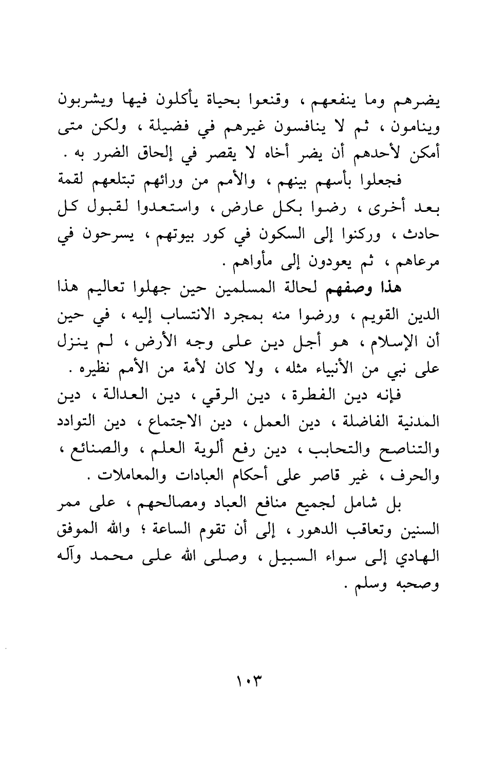 يضرهم وما ينفعهم، وقنعوا بحياة يأكلون فيها ويشربون وينامون؛ ثم لا ينافسون غيرهم في فضيلة؛ ولكن متى أمكن لأحدهم أن يضر أخاه لا يقصر في إلحاق الضرر به؛ فجعلوا بأسهم بينهم، والأمم من ورائهم تبتلعهم لقمة بعد أخرى. رضوا بكل عارض، واستعدوا لقبول كل حادث، وركنوا إلى السكون في كور بيوتهم، يسرحون في مرعاهم، ثم يعودون إلى مأواهم. هذا وصفهم لحالة المسلمين حين جهلوا تعاليم هذا الدين القويم، ورضوا منه بمجرد الانتساب إليه؛ في حين أن الإسلام، هو أجلّ دين على وجه الأرض، لم ينزل على نبي من الأنبياء مثله، ولا كان لأمة من الأمم نظيره. فإنه دين الفطرة، دين الرقي، دين العدالة، دين المدنية الفاضلة، دين العمل، دين الاجتماع، دين التوادد والتناصح والتحابب، دين رفع ألوية العلم، والصنائع، والحرف، غير قاصر على أحكام العبادات والمعاملات، بل شامل لجميع منافع العباد ومصالحهم، على ممر السنين وتعاقب الدهور، إلى أن تقوم الساعة; والله الموفق الهادي إلى سواء السبيل، وصلى الله على محمد وآله وصحبه وسلم.