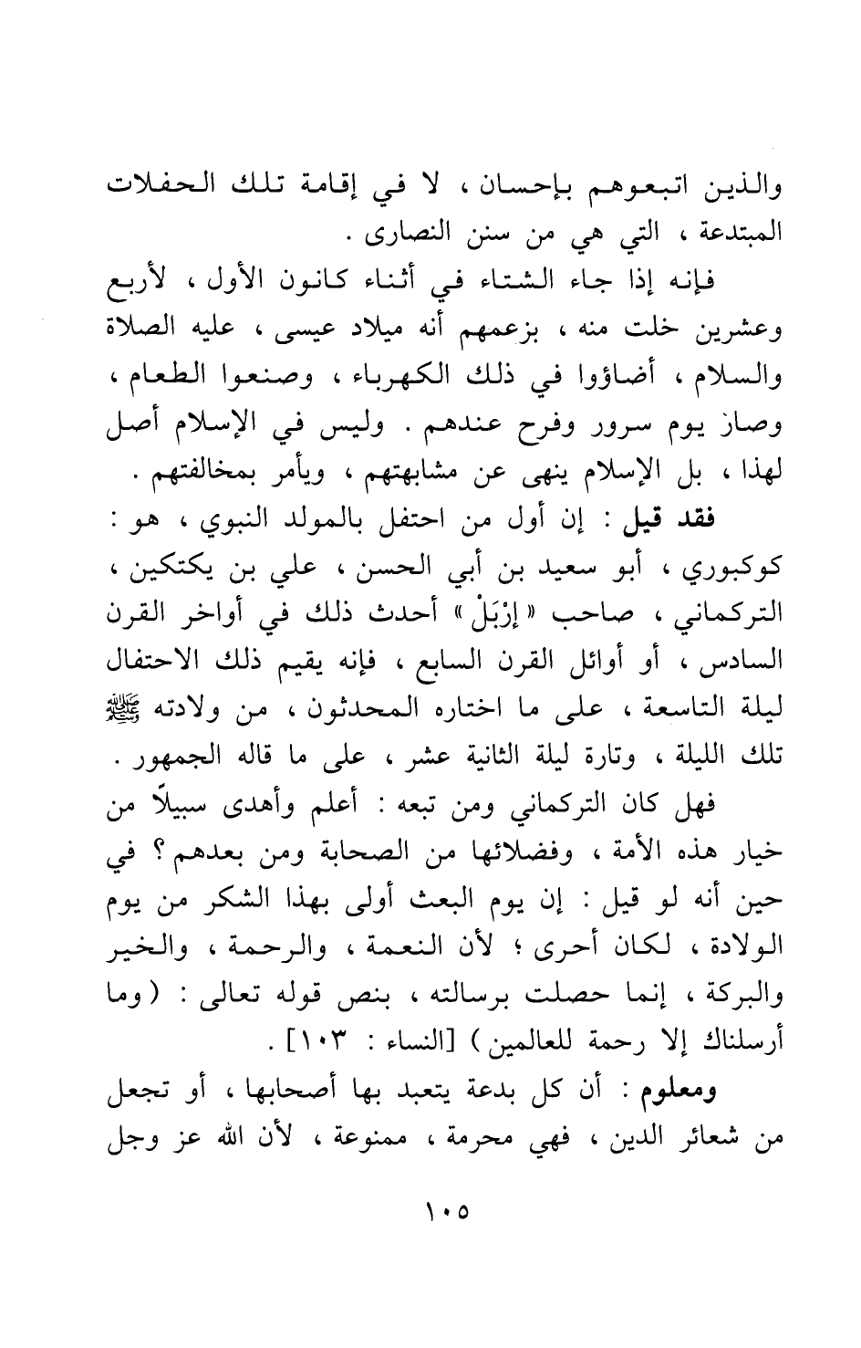 فهل كان التركماني ومن تبعه أعلم وأهدى سبيلا من خيار هذه الأمة وفضلائها من الصحابة ومن بعدهم؟ في حين أنه لو قيل: إن يوم البعث أولى بهذا الشكر من يوم الولادة، لكان أحرى، لأن النعمة، والرحمة، والخير والبركة، إنما حصلت برسالته، بنص قوله تعالى: {وَمَا أَرْسَلْنَاكَ إِلَّا رَحْمَةً لِلْعَالَمِينَ} [سورة الأنبياء آية: 107] .