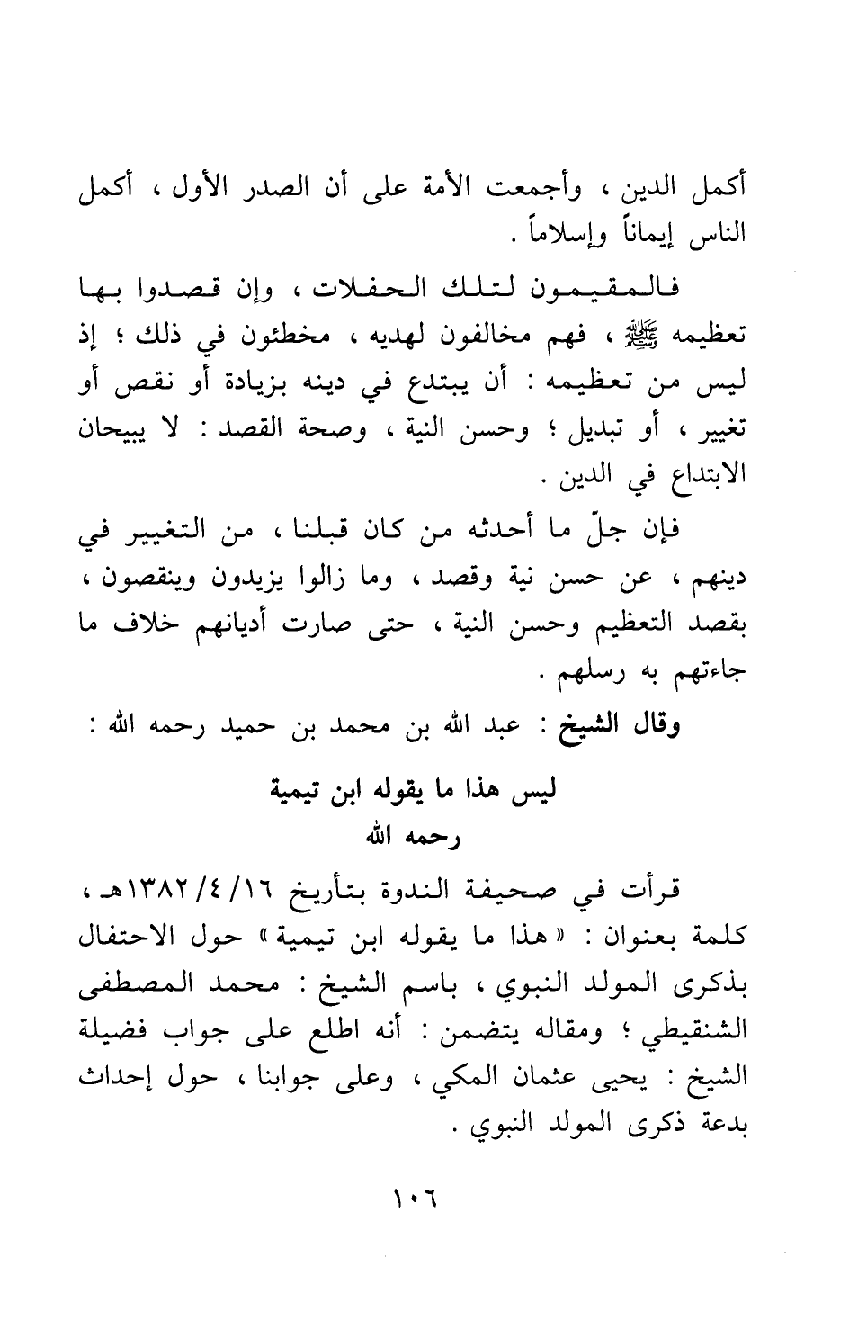 قرأت في صحيفة الندوة بتأريخ 16/4/1382?، كلمة بعنوان: "هذا ما يقوله ابن تيمية" حول الاحتفال بذكرى المولد النبوي، باسم الشيخ: محمد المصطفى الشنقيطي، ومقاله يتضمن أنه اطلع على جواب فضيلة الشيخ: يحيى عثمان المكي، وعلى جوابنا، حول إحداث بدعة ذكرى المولد النبوي.