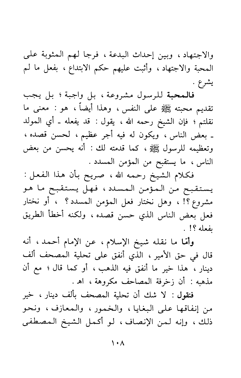 فالمحبة للرسول مشروعة، بل واجبة، بل يجب تقديم محبته صلى الله عليه وسلم على النفس؛ وهذا أيضا هو: معنى ما نقلتم; فإن الشيخ رحمه الله يقول: قد يفعله - أي المولد - بعض الناس، ويكون له فيه أجر عظيم، لحسن قصده، وتعظيمه للرسول صلى الله عليه وسلم كما قدمته لك: أنه يحسن من بعض الناس، ما يستقبح من المؤمن المسدد. فكلام الشيخ رحمه الله، صريح بأن هذا الفعل: يستقبح من المؤمن المسدد، فهل يستقبح ما هو مشروع؟!، وهل نختار فعل المؤمن المسدد، أو نختار فعل بعض الناس الذي حسن قصده، ولكنه أخطأ الطريق بفعله؟!.
