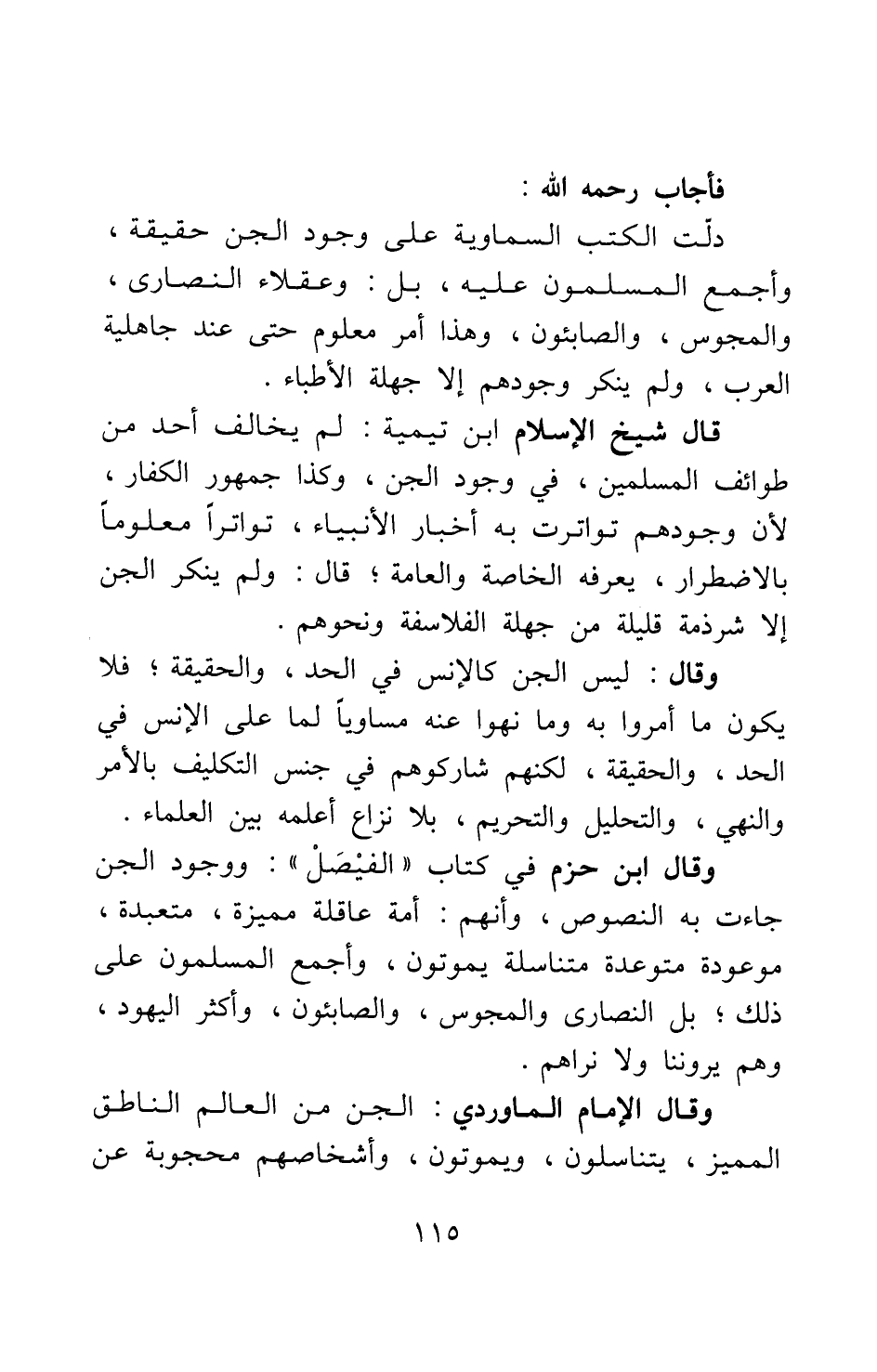 فأجاب رحمه الله: دلّت الكتب السماوية على وجود الجن حقيقة، وأجمع المسلمون عليه، بل وعقلاء النصارى، والمجوس، والصابئون؛ وهذا أمر معلوم حتى عند جاهلية العرب، ولم ينكر وجودهم إلا جهلة الأطباء. قال شيخ الإسلام ابن تيمية: لم يخالف أحد من طوائف المسلمين في وجود الجن، وكذا جمهور الكفار، لأن وجودهم تواترت به أخبار الأنبياء، تواترا معلوما بالاضطرار، يعرفه الخاصة والعامة; قال: ولم ينكر الجن إلا شرذمة قليلة من جهلة الفلاسفة ونحوهم.