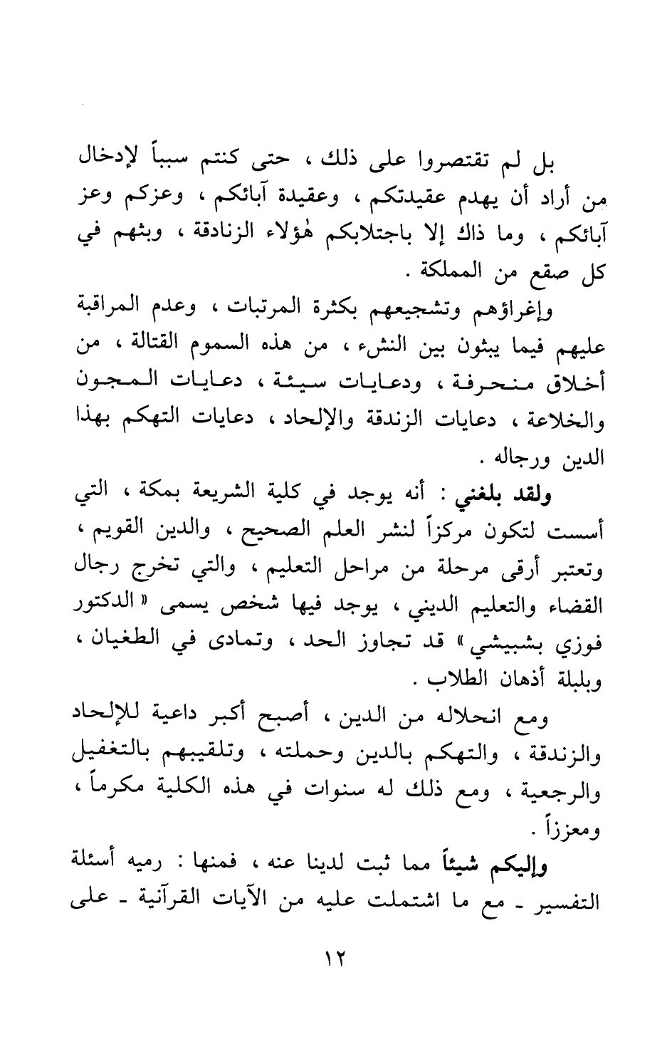 ولقد بلغني أنه يوجد في كلية الشريعة بمكة، التي أسست لتكون مركزا لنشر العلم الصحيح، والدين القويم، وتعتبر أرقى مرحلة من مراحل التعليم، والتي تخرج رجال القضاء والتعليم الديني، يوجد فيها شخص يسمى "الدكتور فوزي بشبيشي" قد تجاوز الحد، وتمادى في الطغيان، وبلبلة أذهان الطلاب.