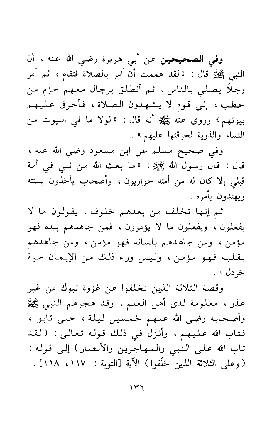 وفي الصحيحين عن أبي هريرة رضي الله عنه أن النبي صلى الله عليه وسلم قال: "لقد هممت أن آمر بالصلاة فتقام، ثم آمر رجلا يصلي بالناس، ثم أنطلق برجال معهم حزم من حطب، إلى قوم لا يشهدون الصلاة، فأحرق عليهم بيوتهم" 1، وروي عنه صلى الله عليه وسلم أنه قال: "لولا ما في البيوت من النساء والذرية لحرقتها عليهم" 2، وفي صحيح مسلم عن ابن مسعود رضي الله عنه قال: قال رسول الله صلى الله عليه وسلم: "ما بعث الله من نبي في أمة قبلي إلا كان له من أمته حواريون، وأصحاب يأخذون بسنته ويهتدون بأمره. ثم إنها تخلف من بعدهم خلوف، يقولون ما لا يفعلون، ويفعلون ما لا يؤمرون. فمن جاهدهم بيده فهو مؤمن، ومن جاهدهم بلسانه فهو مؤمن، ومن جاهدهم بقلبه فهو مؤمن، وليس وراء ذلك من الإيمان حبة خردل". وقصة الثلاثة الذين تخلفوا عن غزوة تبوك من غير عذر، معلومة لدى أهل العلم، وقد هجرهم النبي صلى الله عليه وسلم وأصحابه رضي الله عنهم خمسين ليلة، حتى تابوا، فتاب الله عليهم، وأنزل في ذلك قوله تعالى: {لَقَدْ تَابَ اللَّهُ عَلَى النَّبِيِّ وَالْمُهَاجِرِينَ وَالْأَنْصَارِ} [سورة التوبة آية: 117]