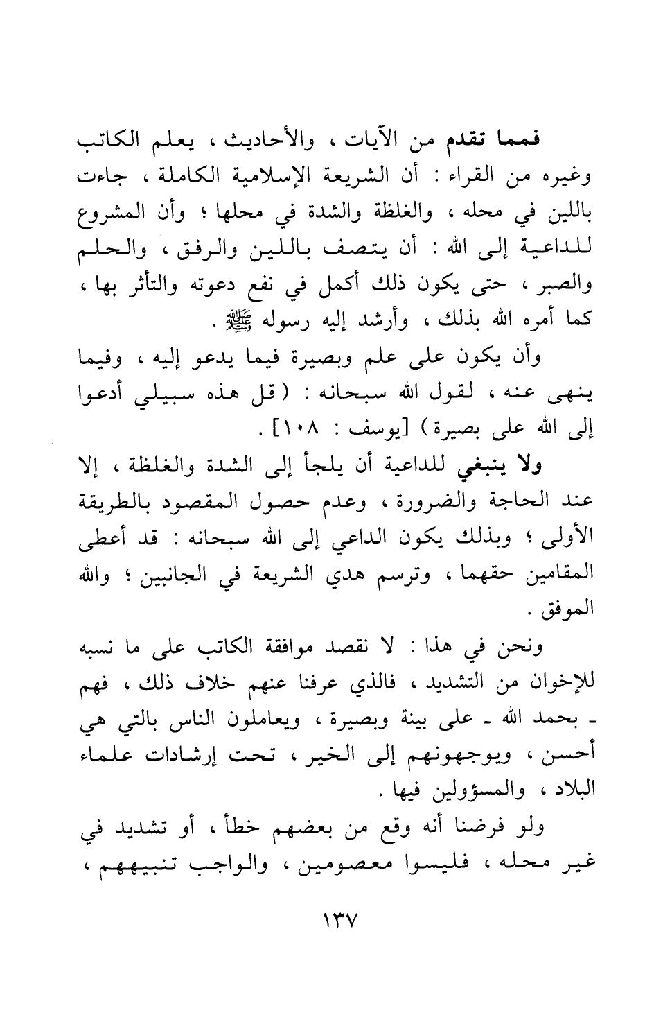 وأن المشروع للداعية إلى الله أن يتصف باللين والرفق، والحلم والصبر، حتى يكون ذلك أكمل في نفع دعوته والتأثر بها، كما أمره الله بذلك، وأرشد إليه رسوله صلى الله عليه وسلم، وأن يكون على علم وبصيرة فيما يدعو إليه، وفيما ينهى عنه، لقول الله سبحانه: {قُلْ هَذِهِ سَبِيلِي أَدْعُو إِلَى اللَّهِ عَلَى بَصِيرَةٍ} [سورة يوسف آية: 108] . ولا ينبغي للداعية أن يلجأ إلى الشدة والغلظة، إلا عند الحاجة والضرورة، وعدم حصول المقصود بالطريقة الأولى؛ وبذلك يكون الداعي إلى الله سبحانه قد أعطى المقامين حقهما، وترسم هدي الشريعة في الجانبين; والله الموفق. ونحن في هذا لا نقصد موافقة الكاتب على ما نسبه للإخوان من التشديد، فالذي عرفنا عنهم خلاف ذلك، فهم - بحمد الله- على بينة وبصيرة، ويعاملون الناس بالتي هي أحسن، ويوجهونهم إلى الخير، تحت إرشادات علماء البلاد، والمسؤولين فيها.