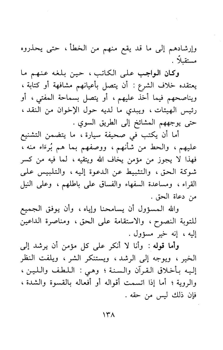 وإرشادهم إلى ما قد يقع منهم من الخطأ، حتى يحذروه مستقبلا. وكان الواجب على الكاتب، حين بلغه عنهم ما يعتقده خلاف الشرع، أن يتصل بأعيانهم مشافهة أو كتابة، ويناصحهم فيما أخذ عليهم، أو يتصل بسماحة المفتي، أو رئيس الهيئات، ويبدي ما لديه حول الإخوان من النقد، حتى يوجههم المشايخ إلى الطريق السوي. أما أن يكتب في صحيفة سيارة ما يتضمن التشنيع عليهم، والحط من شأنهم، ووصفهم بما هم برآء منه، فهذا لا يجوز من مؤمن يخاف الله ويتقيه، لما فيه من كسر شوكة الحق، والتثبيط عن الدعوة إليه، والتلبيس على القراء، ومساعدة السفهاء والفساق على باطلهم، وعلى النيل من دعاة الحق.