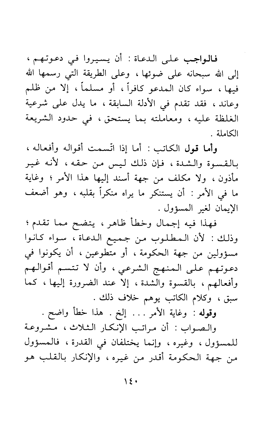 فهذا فيه إجمال وخطأ ظاهر، يتضح مما تقدم; وذلك لأن المطلوب من جميع الدعاة، سواء كانوا مسؤولين من جهة الحكومة، أو متطوعين، أن يكونوا في دعوتهم على المنهج الشرعي، وأن لا تتسم أقوالهم وأفعالهم، بالقسوة والشدة، إلا عند الضرورة إليها، كما سبق؛ وكلام الكاتب يوهم خلاف ذلك.