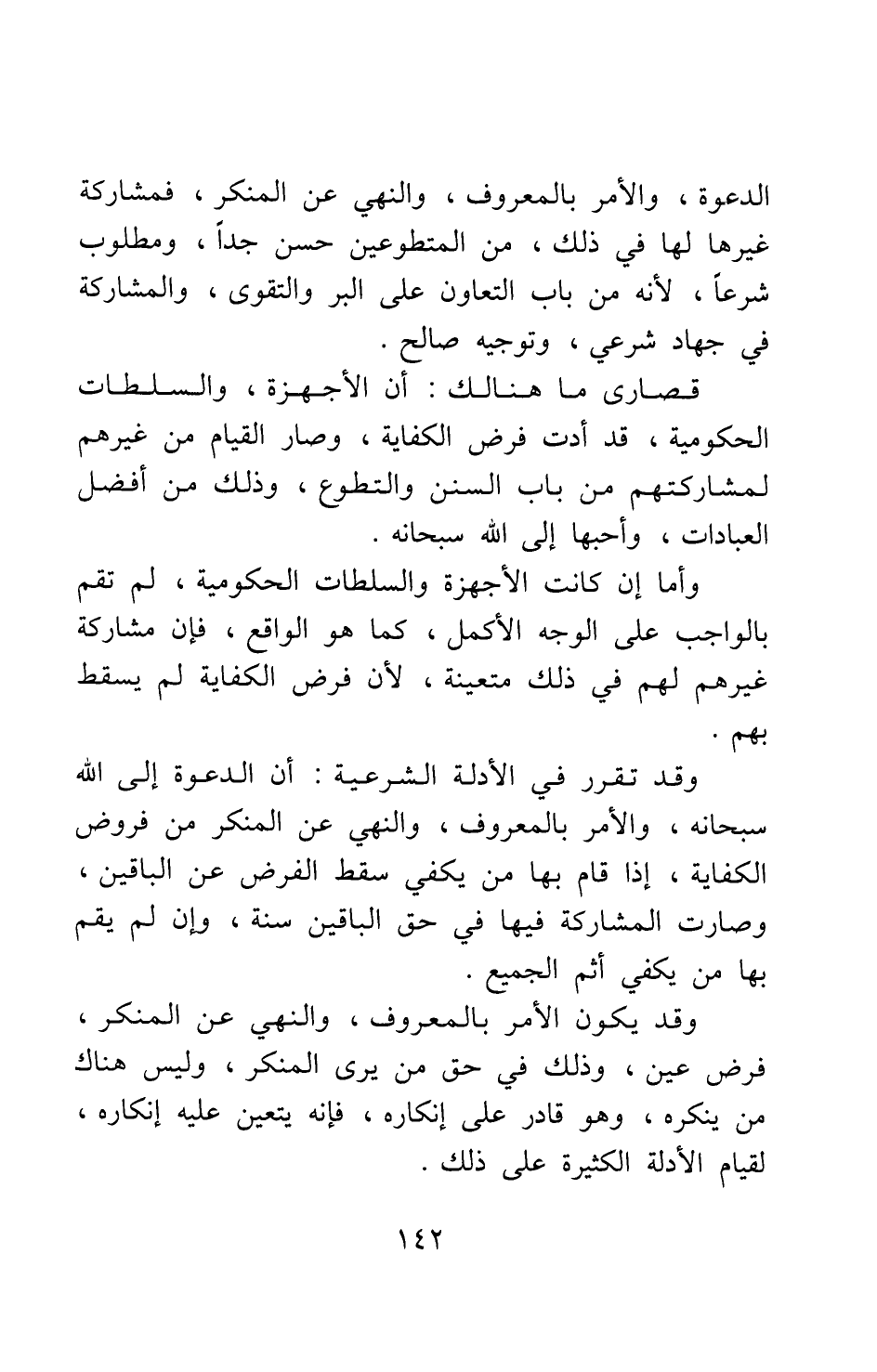 وقد تقرر في الأدلة الشرعية أن الدعوة إلى الله سبحانه، والأمر بالمعروف والنهي عن المنكر من فروض الكفاية، إذا قام بها من يكفي سقط الفرض عن الباقين، وصارت المشاركة فيها في حق الباقين سنة؛ وإن لم يقم بها من يكفي أثم الجميع. وقد يكون الأمر بالمعروف والنهي عن المنكر، فرض عين، وذلك في حق من يرى المنكر، وليس هناك من ينكره، وهو قادر على إنكاره، فإنه يتعين عليه إنكاره، لقيام الأدلة الكثيرة على ذلك.