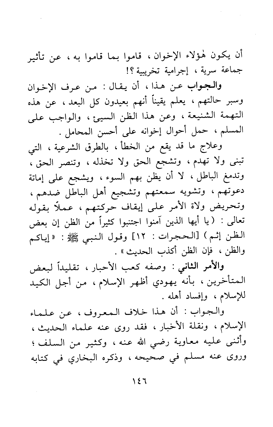 أن يكون هؤلاء الإخوان، قاموا بما قاموا به، عن تأثير جماعة سرية إجرامية تخريبية. والجواب عن هذا، أن يقال: من عرف الإخوان وسبر حالتهم، يعلم يقينا أنهم بعيدون كل البعد عن هذه التهمة الشنيعة، وعن هذا الظن السيئ؛ والواجب على المسلم، حمل أحوال إخوانه على أحسن المحامل، وعلاج ما قد يقع من الخطأ بالطرق الشرعية، التي تبني ولا تهدم، وتشجع الحق ولا تخذله، وتنصر الحق وتدمغ الباطل، لا أن يظن بهم السوء، ويشجع على إماتة دعوتهم، وتشويه سمعتهم وتشجيع أهل الباطل ضدهم، وتحريض ولاة الأمر على إيقاف حركتهم، عملا بقوله تعالى: {يَا أَيُّهَا الَّذِينَ آمَنُوا اجْتَنِبُوا كَثِيراً مِنَ الظَّنِّ إِنَّ بَعْضَ الظَّنِّ إِثْمٌ} [سورة الحجرات آية: 12] ، وقول النبي صلى الله عليه وسلم "إياكم والظن، فإن الظن أكذب الحديث" 1. والأمر الثاني: وصفه كعب الأحبار، تقليدا لبعض المتأخرين، بأنه يهودي أظهر الإسلام، من أجل الكيد للإسلام وإفساد أهله.