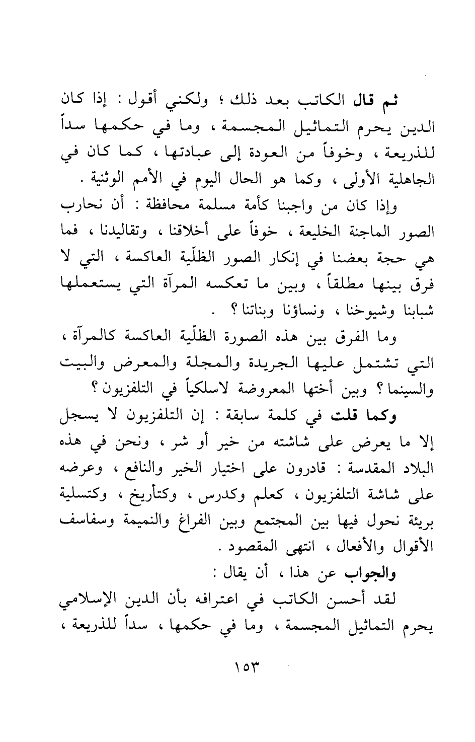 والجواب عن هذا أن يقال: لقد أحسن الكاتب في اعترافه بأن الدين الإسلامي يحرم التماثيل المجسمة، وما في حكمها، سدا للذريعة،