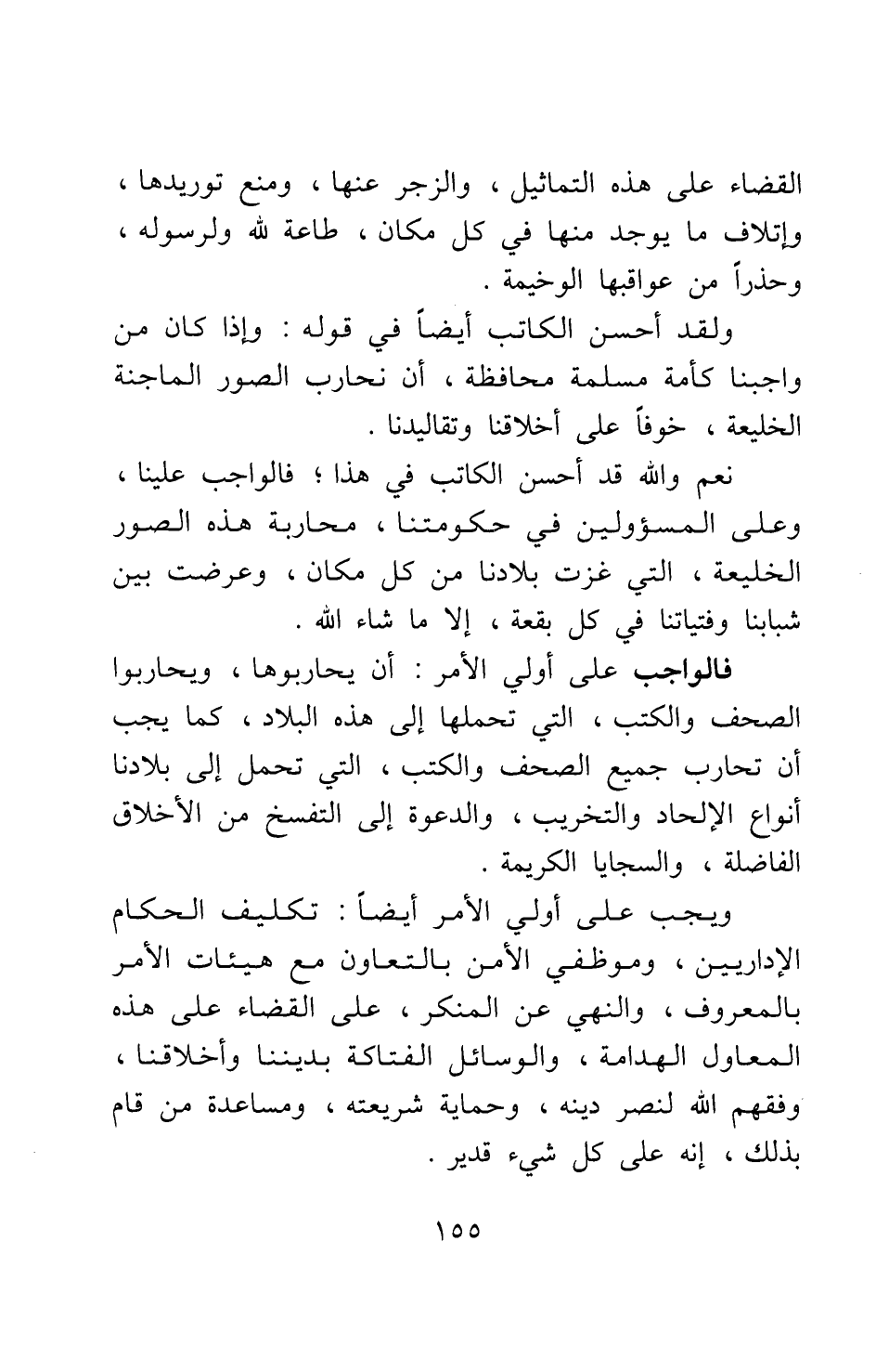 ولقد أحسن الكاتب أيضا في قوله: وإذا كان من واجبنا كأمة مسلمة محافظة، أن نحارب الصور الماجنة الخليعة خوفا على أخلاقنا وتقاليدنا. نعم والله قد أحسن الكاتب في هذا، فالواجب علينا، وعلى المسؤولين في حكومتنا محاربة هذه الصور الخليعة، التي غزت بلادنا من كل مكان، وعرضت بين شبابنا وفتياتنا في كل بقعة، إلا ما شاء الله. فالواجب على أولي الأمر أن يحاربوها، ويحاربوا الصحف والكتب التي تحملها إلى هذه البلاد، كما يجب أن تحارب جميع الصحف والكتب التي تحمل إلى بلادنا أنواع الإلحاد والتخريب، والدعوة إلى التفسخ من الأخلاق الفاضلة والسجايا الكريمة. ويجب على أولي الأمر أيضا تكليف الحكام الإداريين، وموظفي الأمن، بالتعاون مع هيئات الأمر بالمعروف والنهي عن المنكر، على القضاء على هذه المعاول الهدامة، والوسائل الفتاكة بديننا وأخلاقنا وفقهم الله لنصر دينه، وحماية شريعته، ومساعدة من قام بذلك، إنه على كل شيء قدير.