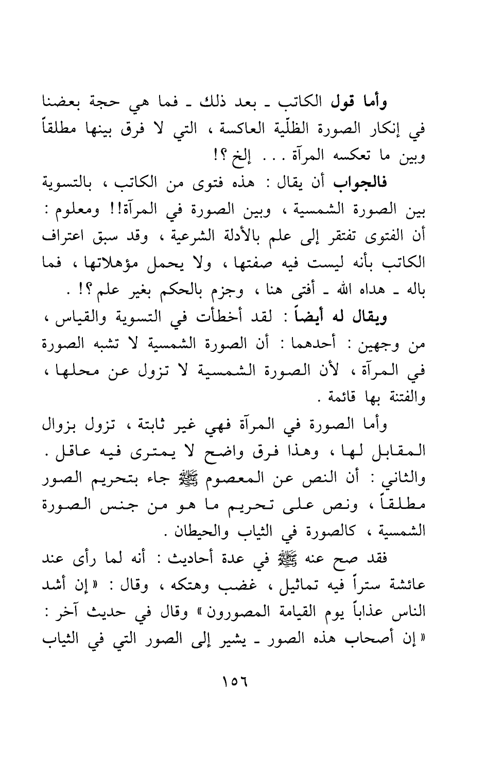 وأما قول الكاتب - بعد ذلك -: فما هي حجة بعضنا في إنكار الصورة الظلية العاكسة التي لا فرق بينها مطلقا وبين ما تعكسه المرآة ... إلخ؟! فالجواب أن يقال: هذه فتوى من الكاتب بالتسوية بين الصورة الشمسية وبين الصورة في المرآة!! ومعلوم: أن الفتوى تفتقر إلى علم بالأدلة الشرعية، وقد سبق اعتراف الكاتب بأنه ليست فيه صفتها، ولا يحمل مؤهلاتها، فما باله- هداه الله- أفتى هنا، وجزم بالحكم بغير علم؟!. ويقال له أيضا: لقد أخطأت في التسوية والقياس، من وجهين: أحدهما: أن الصورة الشمسية لا تشبه الصورة في المرآة، لأن الصورة الشمسية لا تزول عن محلها، والفتنة بها قائمة. وأما الصورة في المرآة فهي غير ثابتة، تزول بزوال المقابل لها، وهذا فرق واضح لا يمترى فيه عاقل.