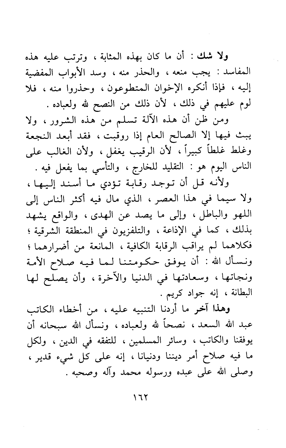 ومن ظن أن هذه الآلة تسلم من هذه الشرور، ولا يبث فيها إلا الصالح العام إذا روقبت، فقد أبعد النجعة وغلط غلطا كبيرا، لأن الرقيب يغفل، ولأن الغالب على الناس اليوم هو التقليد للخارج، والتأسي بما يفعل فيه؛ ولأنه قل أن توجد رقابة تؤدي ما أسند إليها، ولا سيما في هذا العصر الذي مال فيه أكثر الناس إلى اللهو والباطل، وإلى ما يصد عن الهدى؛ والواقع يشهد بذلك، كما في الإذاعة، والتلفزيون في المنطقة الشرقية; فكلاهما لم يراقب الرقابة الكافية المانعة من أضرارهما، ونسأل الله أن يوفق حكومتنا لما فيه صلاح الأمة ونجاتها، وسعادتها في الدنيا والآخرة، وأن يصلح لها البطانة، إنه جواد كريم.