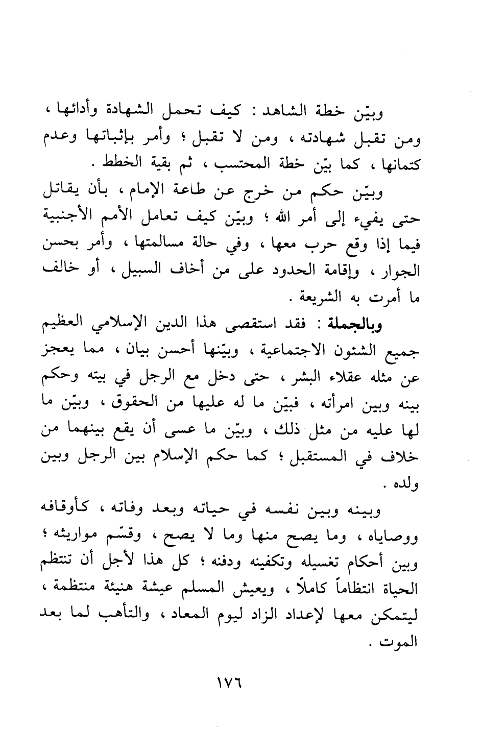 وبالجملة: فقد استقصى هذا الدين الإسلامي العظيم جميع الشؤون الاجتماعية، وبيّنها أحسن بيان، مما يعجز عن مثله عقلاء البشر؛ حتى دخل مع الرجل في بيته وحكم بينه وبين امرأته، فبين ما له عليها من الحقوق، وبيّن ما لها عليه من مثل ذلك، وبيّن ما عسى أن يقع بينهما من خلاف في المستقبل. كما حكم الإسلام بين الرجل وبين ولده، وبينه وبين نفسه في حياته وبعد وفاته، كأوقافه ووصاياه، وما يصح منها وما لا يصح، وقسّم مواريثه، وبين أحكام تغسيله وتكفينه ودفنه. كل هذا لأجل أن تنتظم الحياة انتظاما كاملا، ويعيش المسلم عيشة هنيئة منتظمة، ليتمكن معها لإعداد الزاد ليوم المعاد، والتأهب لما بعد الموت.