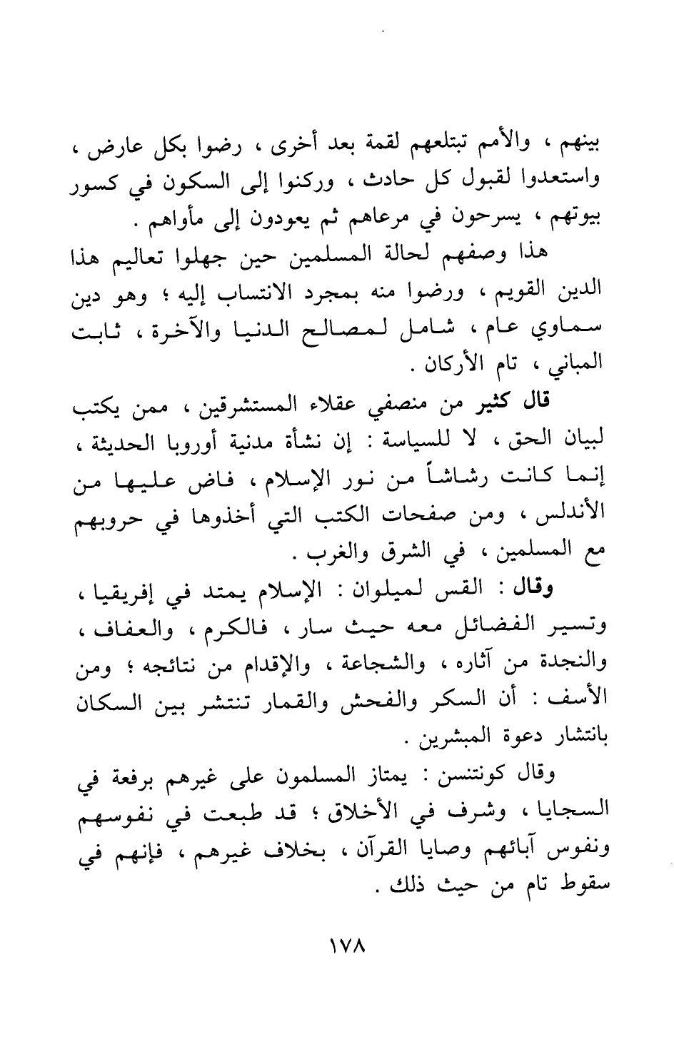 وقال كونتنسن: يمتاز المسلمون على غيرهم برفعة في السجايا، وشرف في الأخلاق؛ قد طبعت في نفوسهم ونفوس آبائهم وصايا القرآن، بخلاف غيرهم، فإنهم في سقوط تام من حيث ذلك.