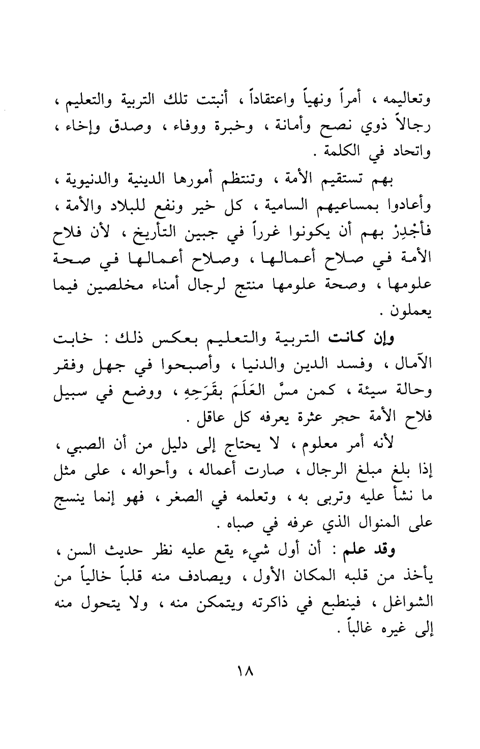 وإن كانت التربية والتعليم بعكس ذلك، خابت الآمال، وفسد الدين والدنيا، وأصبحوا في جهل وفقر وحالة سيئة، كمن مس العلم بقرحه، ووضع في سبيل فلاح الأمة حجر عثرة يعرفه كل عاقل.