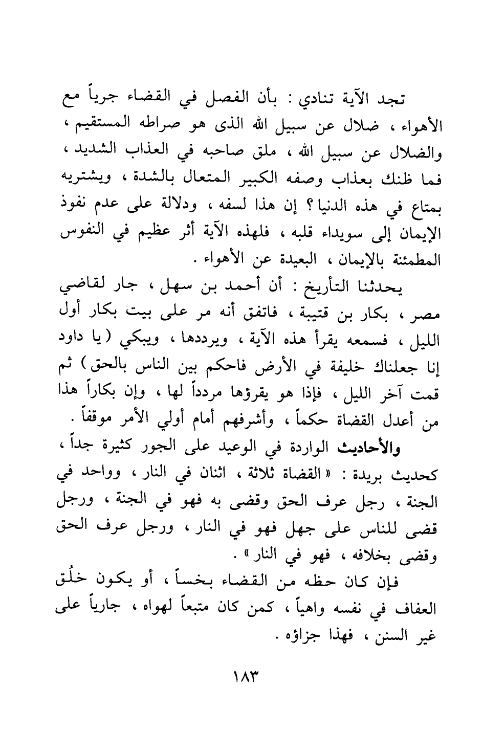 يحدثنا التاريخ أن أحمد بن سهل، جار لقاضي مصر، بكار بن قتيبة، فاتفق أنه مر على بيت بكار أول الليل، فسمعه يقرأ هذه الآية، ويرددها ويبكى {يَا دَاوُدُ إِنَّا جَعَلْنَاكَ خَلِيفَةً فِي الْأَرْضِ فَاحْكُمْ بَيْنَ النَّاسِ بِالْحَقِّ} [سورة ص آية: 26] ثم قمت آخر الليل، فإذا هو يقرؤها مرددا لها، وإن بكارا هذا من أعدل القضاة حكما، وأشرفهم أمام أولي الأمر موقفا.