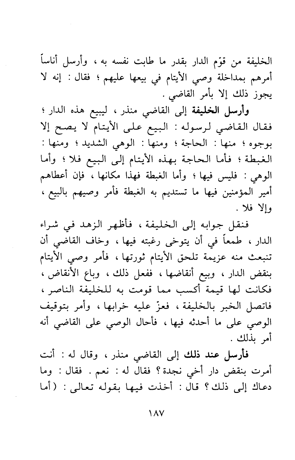 الخليفة من قوّم الدار بقدر ما طابت نفسه به، وأرسل أناسا أمرهم بمداخلة وصي الأيتام في بيعها عليهم; فقال: إنه لا يجوز ذلك إلا بأمر القاضي.