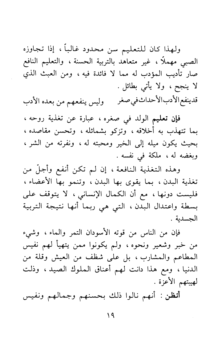 ولهذا كان للتعليم سن محدود غالبا، إذا تجاوزه الصبي مهملا، غير متعاهد بالتربية الحسنة والتعليم النافع صار تأديب المؤدب له مما لا فائدة فيه، ومن العبث الذي لا ينجح، ولا يأتي بطائل.