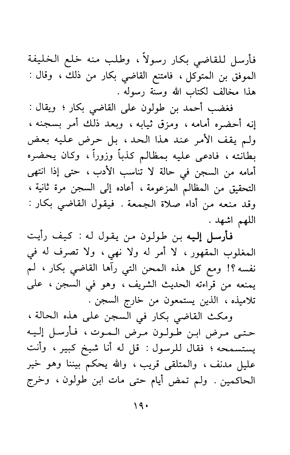 ومكث القاضي بكار في السجن على هذه الحالة، حتى مرض ابن طولون مرض الموت، فأرسل إليه يستسمحه، فقال للرسول: قل له: أنا شيخ كبير، وأنت عليل مدنف، والملتقى قريب، والله يحكم بيننا وهو خير الحاكمين. ولم تمض أيام حتى مات ابن طولون، وخرج