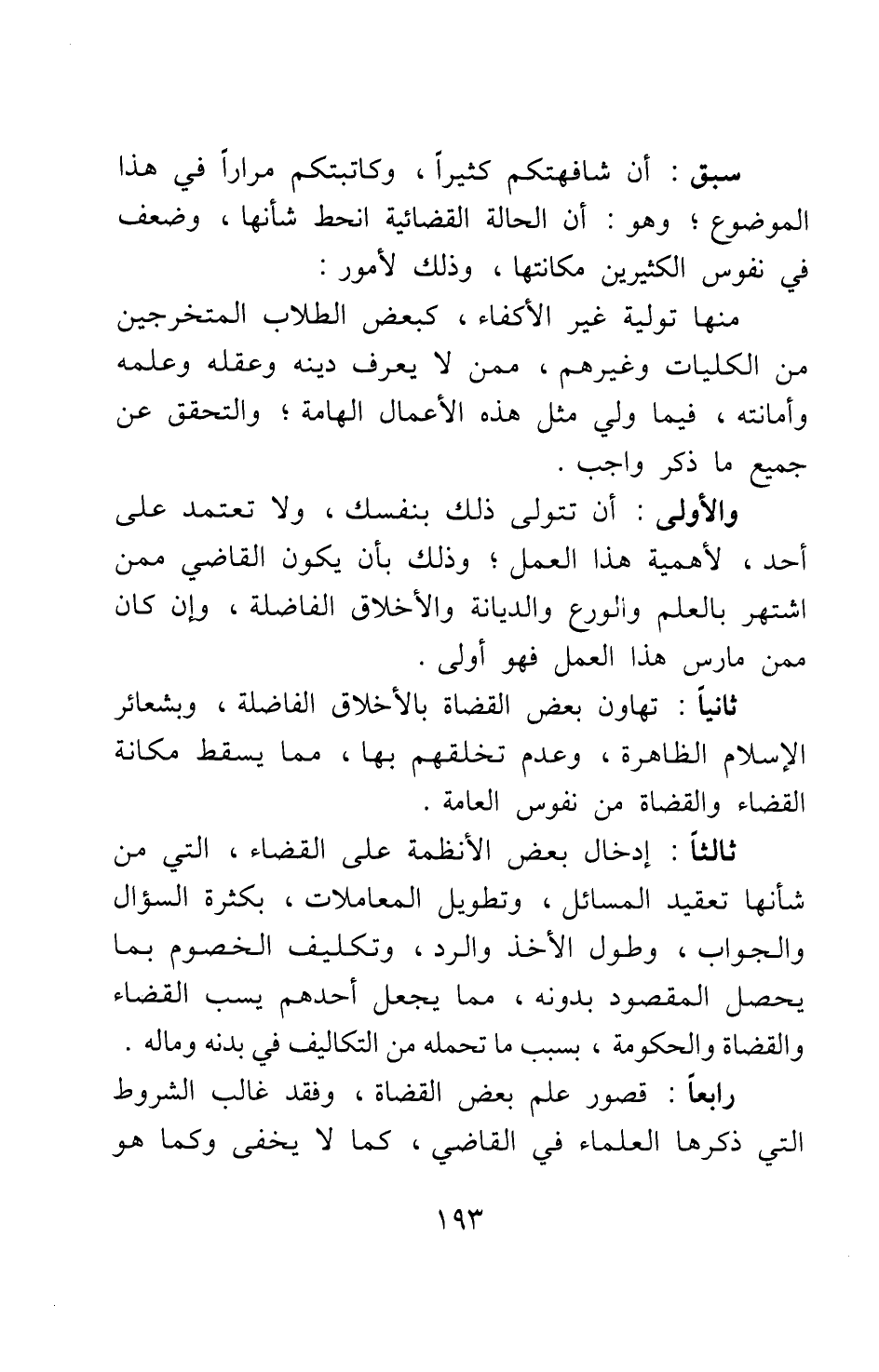 سبق أن شافهتكم كثيرا، وكاتبتكم مرارا في هذا الموضوع; وهو: أن الحالة القضائية انحط شأنها، وضعف في نفوس الكثيرين مكانتها، وذلك لأمور: