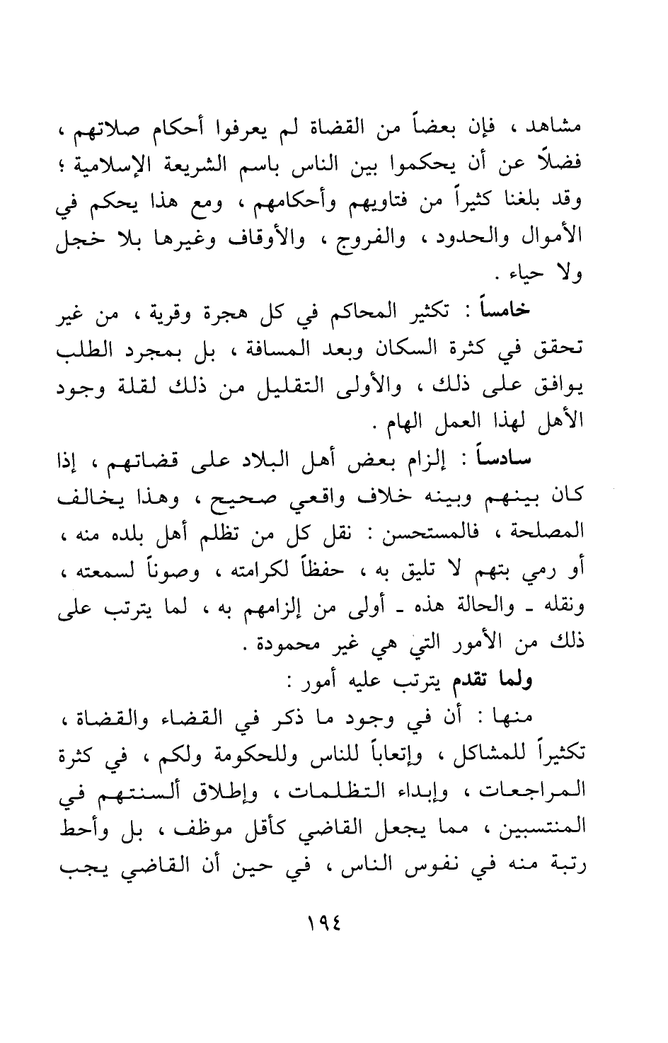 خامسا: تكثير المحاكم في كل هجرة وقرية، من غير تحقق في كثرة السكان وبعد المسافة، بل بمجرد الطلب يوافق على ذلك، والأولى التقليل من ذلك لقلة وجود الأهل لهذا العمل الهام.