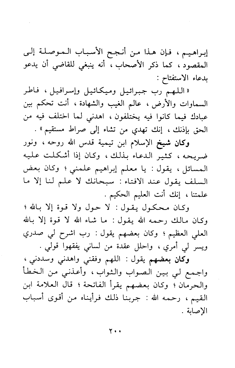 وكان شيخ الإسلام ابن تيمية قدس الله روحه، ونور ضريحه، كثير الدعاء بذلك، وكان إذا أشكلت عليه المسائل، يقول: يا معلم إبراهيم علمني; وكان بعض السلف يقول عند الإفتاء: سبحانك لا علم لنا إلا ما علمتنا، إنك أنت العليم الحكيم. وكان مكحول يقول: لا حول ولا قوة إلا بالله. وكان مالك رحمه الله يقول: ما شاء الله لا قوة إلا بالله العلي العظيم; وكان بعضهم يقول: رب اشرح لي صدري ويسر لي أمري، واحلل عقدة من لساني يفقهوا قولي. وكان بعضهم يقول: اللهم وفقني واهدني وسددني، واجمع لي بين الصواب والثواب، وأعذني من الخطأ والحرمان; وكان بعضهم يقرأ الفاتحة; قال العلامة ابن القيم، رحمه الله: جربنا ذلك فرأيناه من أقوى أسباب الإصابة.