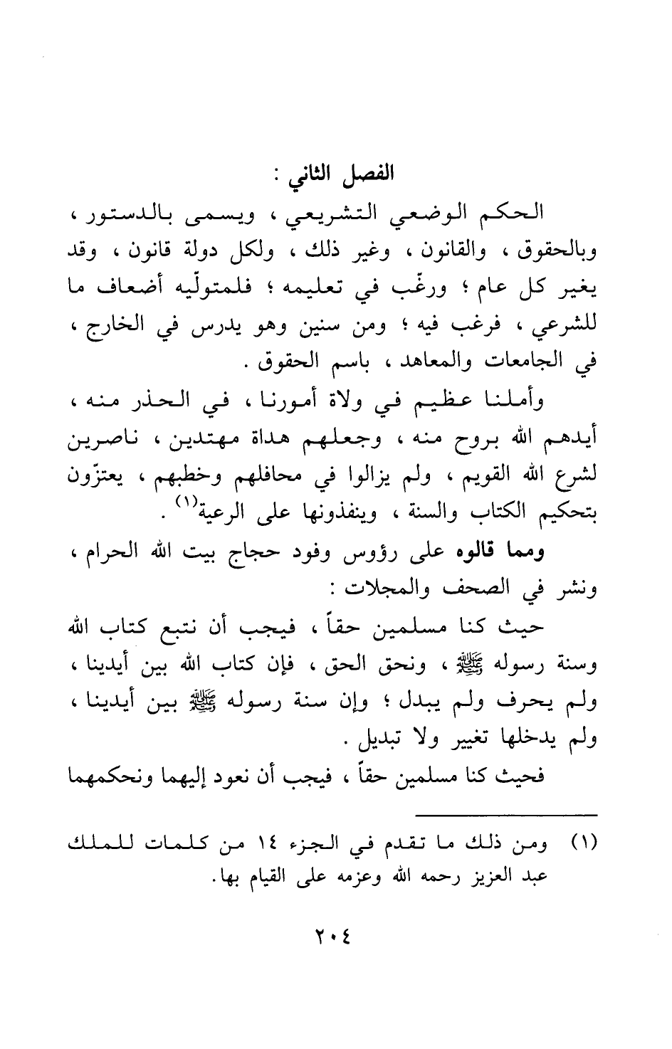 وأملنا عظيم في ولاة أمورنا، في الحذر منه، أيدهم الله بروح منه، وجعلهم هداة مهتدين، ناصرين لشرع الله القويم، ولم يزالوا في محافلهم وخطبهم، يعتزون بتحكيم الكتاب والسنة، وينفذونها على الرعية. 1.