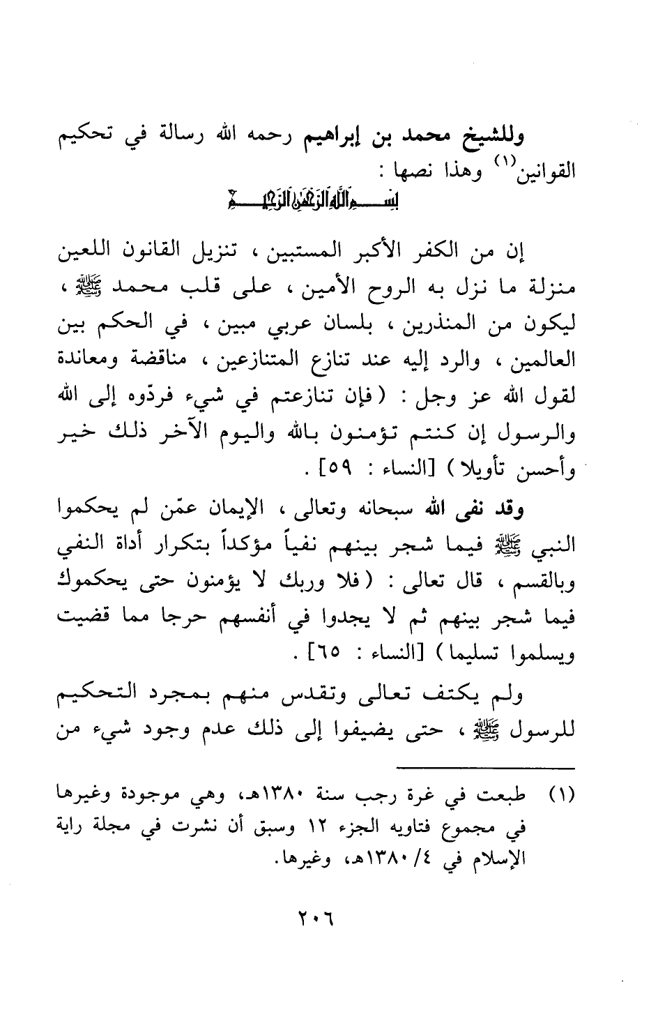 وللشيخ محمد بن إبراهيم رحمه الله رسالة في تحكيم القوانين وهذا نصها: 1