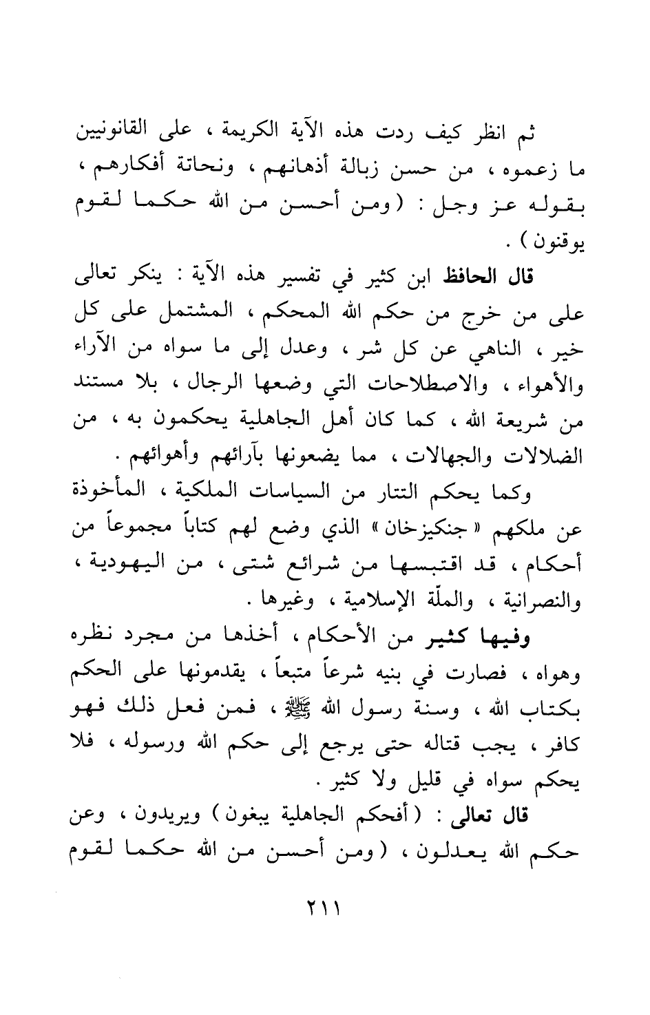 قال الحافظ ابن كثير في تفسير هذه الآية: ينكر تعالى على من خرج من حكم الله المحكم، المشتمل على كل خير، الناهي عن كل شر، وعدل إلى ما سواه من الآراء والأهواء، والاصطلاحات التي وضعها الرجال، بلا مستند من شريعة الله، كما كان أهل الجاهلية يحكمون به من الضلالات والجهالات، مما يضعونها بآرائهم وأهوائهم، وكما يحكم التتار من السياسات الملكية المأخوذة عن ملكهم "جنكيزخان" الذي وضع لهم كتابا مجموعا من أحكام، قد اقتبسها من شرائع شتى من اليهودية، والنصرانية، والملة الإسلامية، وغيرها، وفيها كثير من الأحكام أخذها من مجرد نظره وهواه، فصارت في بنيه شرعا متبعا، يقدمونها على الحكم بكتاب الله، وسنة رسول الله صلى الله عليه وسلم؛ فمن فعل ذلك فهو كافر يجب قتاله حتى يرجع إلى حكم الله ورسوله، فلا يحكم سواه في قليل ولا كثير. فال تعالى:
