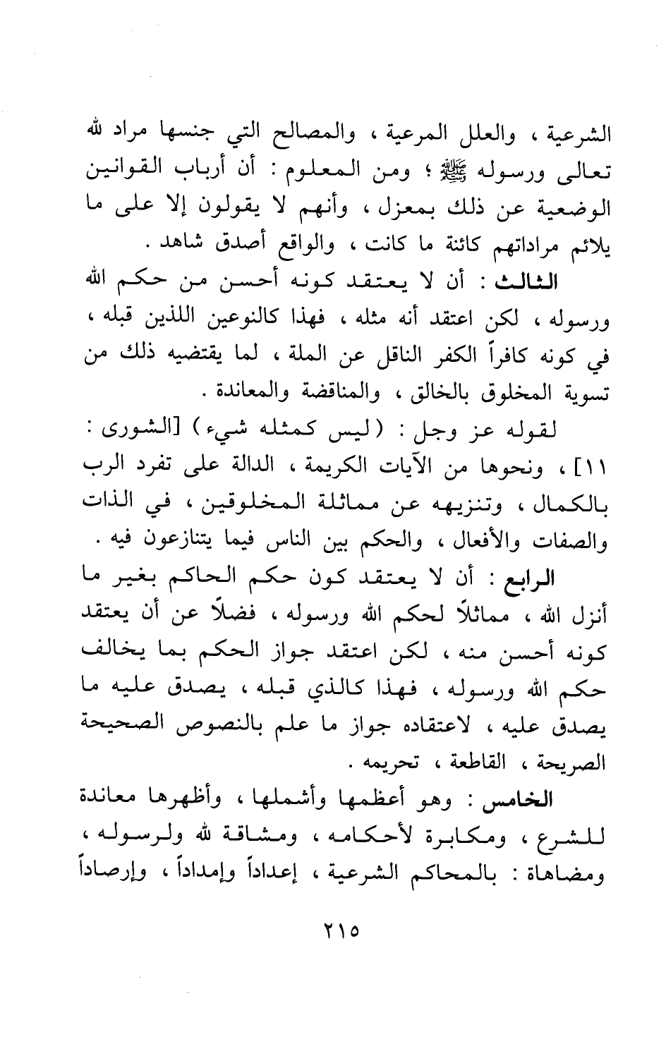 الثالث: أن لا يعتقد كونه أحسن من حكم الله ورسوله، لكن اعتقد أنه مثله؛ فهذا كالنوعين اللذين قبله، في كونه كافرا الكفر الناقل عن الملة، لما يقتضيه ذلك من تسوية المخلوق بالخالق، والمناقضة والمعاندة لقوله عز وجل {لَيْسَ كَمِثْلِهِ شَيْءٌ} [سورة الشورى آية: 11] ونحوها من الآيات الكريمة، الدالة على تفرد الرب بالكمال، وتنْزيهه عن مماثلة المخلوقين في الذات والصفات والأفعال، والحكم بين الناس فيما يتنازعون فيه.