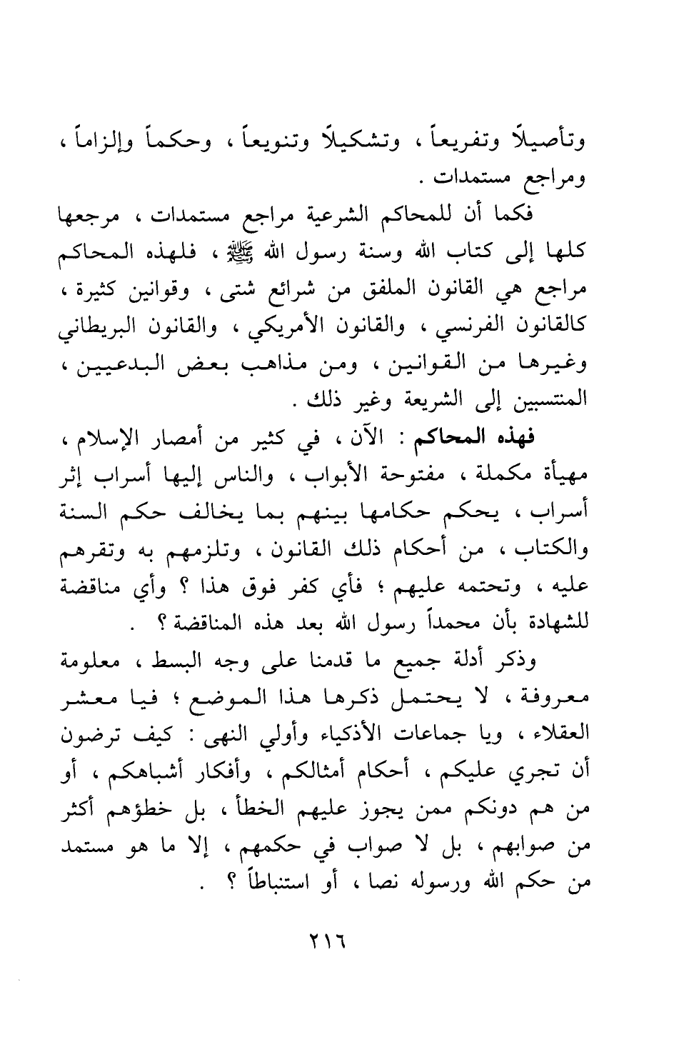 وتأصيلا وتفريعا، وتشكيلا وتنويعا، وحكما وإلزاما، ومراجع مستمدات. فكما أن للمحاكم الشرعية مراجع مستمدات مرجعها كلها إلى كتاب الله وسنة رسول الله صلى الله عليه وسلم، فلهذه المحاكم مراجع هي القانون الملفق من شرائع شتى، وقوانين كثيرة، كالقانون الفرنسي، والقانون الأمريكي، والقانون البريطاني وغيرها من القوانين، ومن مذاهب بعض البدعيين المنتسبين إلى الشريعة وغير ذلك. فهذه المحاكم الآن في كثير من أمصار الإسلام، مهيأة مكملة، مفتوحة الأبواب، والناس إليها أسراب إثر أسراب، يحكم حكامها بينهم بما يخالف حكم السنة والكتاب، من أحكام ذلك القانون، وتلزمهم به وتقرهم عليه، وتحتمه عليهم، فأي كفر فوق هذا؟ وأي مناقضة للشهادة بأن محمدا رسول الله بعد هذه المناقضة؟ وذكر أدلة جميع ما قدمنا على وجه البسط، معلومة معروفة، لا يحتمل ذكرها هذا الموضع. فيا معشر العقلاء، ويا جماعات الأذكياء وأولي النهى، كيف ترضون أن تجري عليكم أحكام أمثالكم، وأفكار أشباهكم، أو من هم دونكم ممن يجوز عليهم الخطأ، بل خطؤهم أكثر من صوابهم، بل لا صواب في حكمهم، إلا ما هو مستمد من حكم الله ورسوله نصا أو استنباطا؟