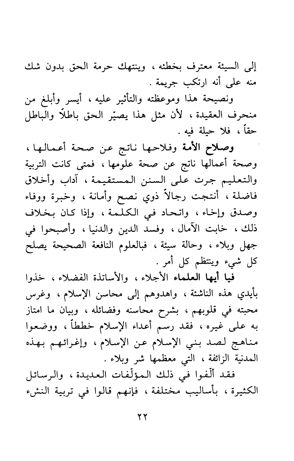 إلى السيئة معترف بخطئه، وينتهك حرمة الحق بدون شك منه على أنه ارتكب جريمة. ونصيحة هذا وموعظته والتأثير عليه، أيسر وأبلغ من منحرف العقيدة، لأن مثل هذا يصير الحق باطلا والباطل حقا، فلا حيلة فيه. وصلاح الأمة وفلاحها ناتج عن صحة أعمالها، وصحة أعمالها ناتج عن صحة علومها؛ فمتى كانت التربية والتعليم جرت على السنن المستقيمة، آداب وأخلاق فاضلة، أنتجت رجالا ذوي نصح وأمانة، وخبرة ووفاء، وصدق وإخاء، واتحاد في الكلمة، وإذا كان بخلاف ذلك، خابت الآمال، وفسد الدين والدنيا، وأصبحوا في جهل وبلاء، وحالة سيئة؛ فبالعلوم النافعة الصحيحة يصلح كل شيء وينتظم كل أمر.