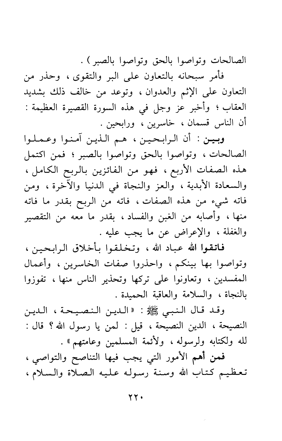 الصَّالِحَاتِ وَتَوَاصَوْا بِالْحَقِّ وَتَوَاصَوْا بِالصَّبْرِ} [سورة العصر آية: 3-1] . فأمر سبحانه بالتعاون على البر والتقوى، وحذر من التعاون على الإثم والعدوان، وتوعد من خالف ذلك بشديد العقاب. وأخبر عز وجل في هذه السورة القصيرة العظيمة أن الناس قسمان، خاسرين، ورابحين. وبين أن الرابحين هم الذين آمنوا وعملوا الصالحات، وتواصوا بالحق وتواصوا بالصبر؛ فمن اكتمل هذه الصفات الأربع، فهو من الفائزين بالربح الكامل، والسعادة الأبدية، والعز والنجاة في الدنيا والآخرة؛ ومن فاته شيء من هذه الصفات، فاته من الربح بقدر ما فاته منها؛ وأصابه من الغبن والفساد، بقدر ما معه من التقصير والغفلة والإعراض عن ما يجب عليه. فاتقوا الله عباد الله، وتخلقوا بأخلاق الرابحين، وتواصوا بها بينكم، واحذروا صفات الخاسرين، وأعمال المفسدين، وتعاونوا على تركها وتحذير الناس منها، تفوزوا بالنجاة، والسلامة والعاقبة الحميدة. وقد قال النبي صلى الله عليه وسلم "الدين النصيحة، الدين النصيحة، الدين النصيحة، قيل: لمن يا رسول الله؟ قال: لله ولكتابه ولرسوله، ولأئمة المسلمين، وعامتهم" 1.
