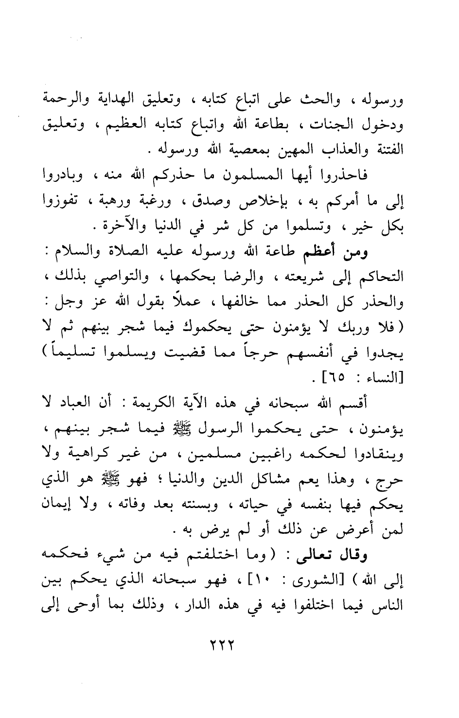 ومن أعظم طاعة الله ورسوله عليه الصلاة والسلام: التحاكم إلى شريعته، والرضى بحكمها، والتواصي بذلك، والحذر كل الحذر مما خالفها، عملا بقول الله عز وجل: {فَلا وَرَبِّكَ لا يُؤْمِنُونَ حَتَّى يُحَكِّمُوكَ فِيمَا شَجَرَ بَيْنَهُمْ ثُمَّ لا يَجِدُوا فِي أَنْفُسِهِمْ حَرَجاً مِمَّا قَضَيْتَ وَيُسَلِّمُوا تَسْلِيماً} [سورة النساء آية: 65] : أقسم الله سبحانه في هذه الآية الكريمة أن العباد لا يؤمنون، حتى يحكموا الرسول صلى الله عليه وسلم فيما شجر بينهم، وينقادوا لحكمه راغبين مسلمين، من غير كراهية ولا حرج؛ وهذا يعم مشاكل الدين والدنيا. فهو صلى الله عليه وسلم هو الذي يحكم فيها بنفسه في حياته، وبسنته بعد وفاته، ولا إيمان لمن أعرض عن ذلك أو لم يرض به.
