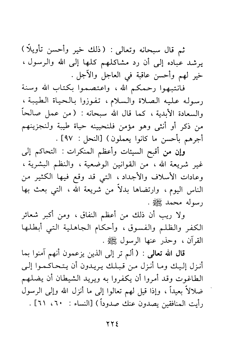 وإن من أقبح السيئات وأعظم المنكرات: التحاكم إلى غير شريعة الله، من القوانين الوضعية، والنظم البشرية وعادات الأسلاف والأجداد، التي قد وقع فيها الكثير من الناس اليوم، وارتضاها بدلا من شريعة الله التي بعث بها رسوله محمد صلى الله عليه وسلم. ولا ريب أن ذلك من أعظم النفاق، ومن أكبر شعائر الكفر والظلم والفسوق، وأحكام الجاهلية التي أبطلها القرآن، وحذر عنها الرسول صلى الله عليه وسلم. قال الله تعالى: {أَلَمْ تَرَ إِلَى الَّذِينَ يَزْعُمُونَ أَنَّهُمْ آمَنُوا بِمَا أُنْزِلَ إِلَيْكَ وَمَا أُنْزِلَ مِنْ قَبْلِكَ يُرِيدُونَ أَنْ يَتَحَاكَمُوا إِلَى الطَّاغُوتِ وَقَدْ أُمِرُوا أَنْ يَكْفُرُوا بِهِ وَيُرِيدُ الشَّيْطَانُ أَنْ يُضِلَّهُمْ ضَلالاً بَعِيداً وَإِذَا قِيلَ لَهُمْ تَعَالَوْا إِلَى مَا أَنْزَلَ اللَّهُ وَإِلَى الرَّسُولِ رَأَيْتَ الْمُنَافِقِينَ يَصُدُّونَ عَنْكَ صُدُوداً} [سورة النساء آية: 61-60] .