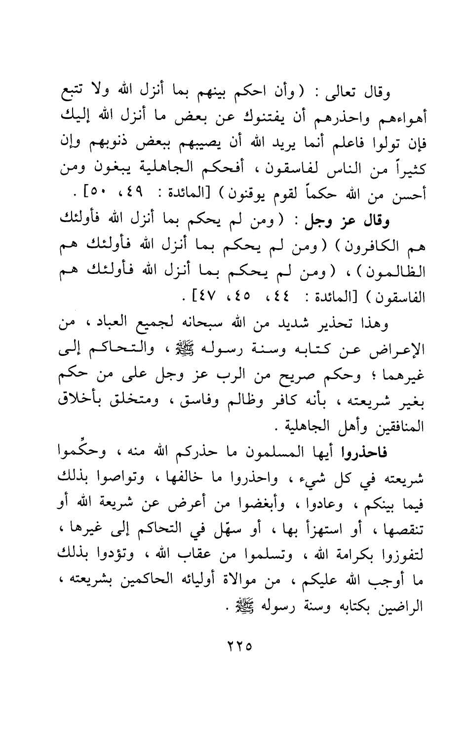 وقال تعالى: {وَأَنِ احْكُمْ بَيْنَهُمْ بِمَا أَنْزَلَ اللَّهُ وَلا تَتَّبِعْ أَهْوَاءَهُمْ وَاحْذَرْهُمْ أَنْ يَفْتِنُوكَ عَنْ بَعْضِ مَا أَنْزَلَ اللَّهُ إِلَيْكَ فَإِنْ تَوَلَّوْا فَاعْلَمْ أَنَّمَا يُرِيدُ اللَّهُ أَنْ يُصِيبَهُمْ بِبَعْضِ ذُنُوبِهِمْ وَإِنَّ كَثِيراً مِنَ النَّاسِ لَفَاسِقُونَ أَفَحُكْمَ الْجَاهِلِيَّةِ يَبْغُونَ وَمَنْ أَحْسَنُ مِنَ اللَّهِ حُكْماً لِقَوْمٍ يُوقِنُونَ} [سورة المائدة آية: 50-49] ، وقال عز وجل: {وَمَنْ لَمْ يَحْكُمْ بِمَا أَنْزَلَ اللَّهُ فَأُولَئِكَ هُمُ الْكَافِرُونَ} [سورة المائدة آية: 44] ، {وَمَنْ لَمْ يَحْكُمْ بِمَا أَنْزَلَ اللَّهُ فَأُولَئِكَ هُمُ الظَّالِمُونَ} [سورة المائدة آية: 45] ، {وَمَنْ لَمْ يَحْكُمْ بِمَا أَنْزَلَ اللَّهُ فَأُولَئِكَ هُمُ الْفَاسِقُونَ} [سورة المائدة آية: 47] : وهذا تحذير شديد من الله سبحانه لجميع العباد، من الإعراض عن كتابه وسنة رسوله صلى الله عليه وسلم، والتحاكم إلى غيرهما، وحكم صريح من الرب عز وجل على من حكم بغير شريعته، بأنه كافر وظالم وفاسق، ومتخلق بأخلاق المنافقين وأهل الجاهلية.