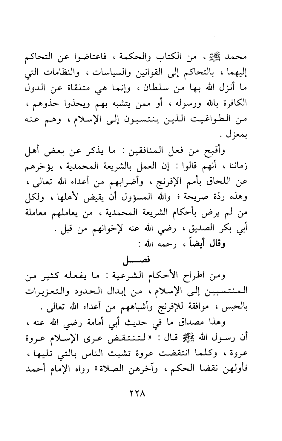 محمد صلى الله عليه وسلم من الكتاب والحكمة؛ فاعتاضوا عن التحاكم إليهما بالتحاكم إلى القوانين والسياسات، والنظامات التي ما أنزل الله بها من سلطان، وإنما هي متلقاة عن الدول الكافرة بالله ورسوله، أو ممن يتشبه بهم ويحذو حذوهم، من الطواغيت الذين ينتسبون إلى الإسلام، وهم عنه بمعزل. وأقبح من فعل المنافقين ما يذكر عن بعض أهل زماننا أنهم قالوا. إن العمل بالشريعة المحمدية يؤخرهم عن اللحاق بأمم الإفرنج، وأضرابهم من أعداء الله تعالى: وهذه ردة صريحة. والله المسؤول أن يقيض لأهلها، ولكل من لم يرض بأحكام الشريعة المحمدية، من يعاملهم معاملة أبي بكر الصديق، رضي الله عنه لإخوانهم من قبل.