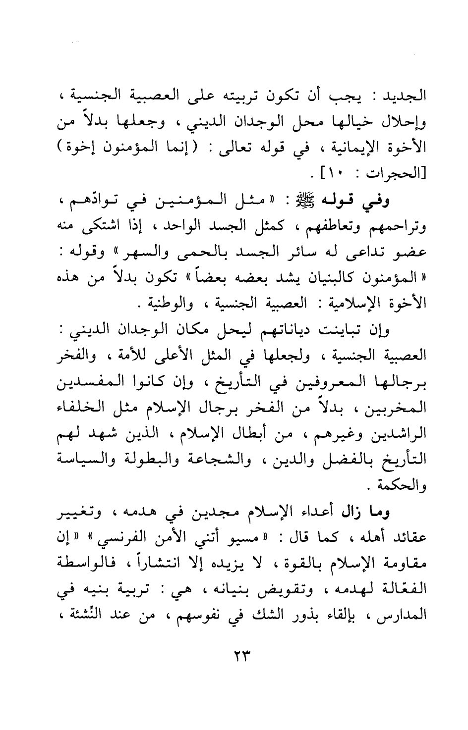 أن تكون تربيته على العصبية الجنسية، وإحلال خيالها محل الوجدان الديني، وجعلها بدلا من الأخوة الإيمانية، في قوله تعالى: {إِنَّمَا الْمُؤْمِنُونَ إِخْوَةٌ} [سورة الحجرات آية: 10] وفي قوله صلى الله عليه وسلم: "مثل المؤمنين في توادهم وتراحمهم وتعاطفهم، كمثل الجسد الواحد، إذا اشتكى منه عضو تداعى له سائر الجسد بالحمى والسهر" 1، وقوله: "المؤمنون كالبنيان يشد بعضه بعضا" 2؛ تكون بدلا من هذه الأخوة الإسلامية: العصبية الجنسية والوطنية، وإن تباينت دياناتهم، ليحل مكان الوجدان الديني: العصبية الجنسية، ولجعلها في المثل الأعلى للأمة، والفخر برجالها المعروفين في التأريخ، وإن كانوا المفسدين المخربين، بدلا من الفخر برجال الإسلام مثل الخلفاء الراشدين وغيرهم من أبطال الإسلام الذين شهد لهم التأريخ بالفضل والدين، والشجاعة والبطولة والسياسة والحكمة.