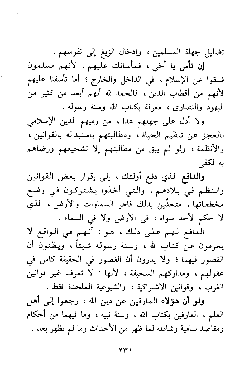 إن تأس يا أخي، فمأساتك عليهم، لأنهم مسلمون فسقوا عن الإسلام، في الداخل والخارج. أما تأسفنا عليهم لأنهم من أقطاب الدين، فالحمد لله أنهم أبعد من كثير من اليهود والنصارى معرفة بكتاب الله وسنة رسوله. ولا أدل على جهلهم هذا، من رميهم الدين الإسلامي بالعجز عن تنظيم الحياة، ومطالبتهم باستبداله بالقوانين، والأنظمة، ولو لم يبق من مطالبتهم إلا تشجيعهم ورضاهم به لكفى. والدافع الذي دفع أولئك، إلى إقرار بعض القوانين والنظم في بلادهم، والتي أخذوا يشتركون في وضع مخططاتها، متحدين بذلك فاطر السماوات والأرض الذي لا حكم لأحد سواه، في الأرض ولا في السماء، الدافع لهم على ذلك، هو أنهم في الواقع لا يعرفون عن كتاب الله، وسنة رسوله شيئا، ويظنون أن القصور فيهما، ولا يدرون أن القصور في الحقيقة كامن في عقولهم، ومداركهم السخيفة؛ لأنها لا تعرف غير قوانين الغرب، وقوانين الاشتراكية والشيوعية الملحدة فقط.
