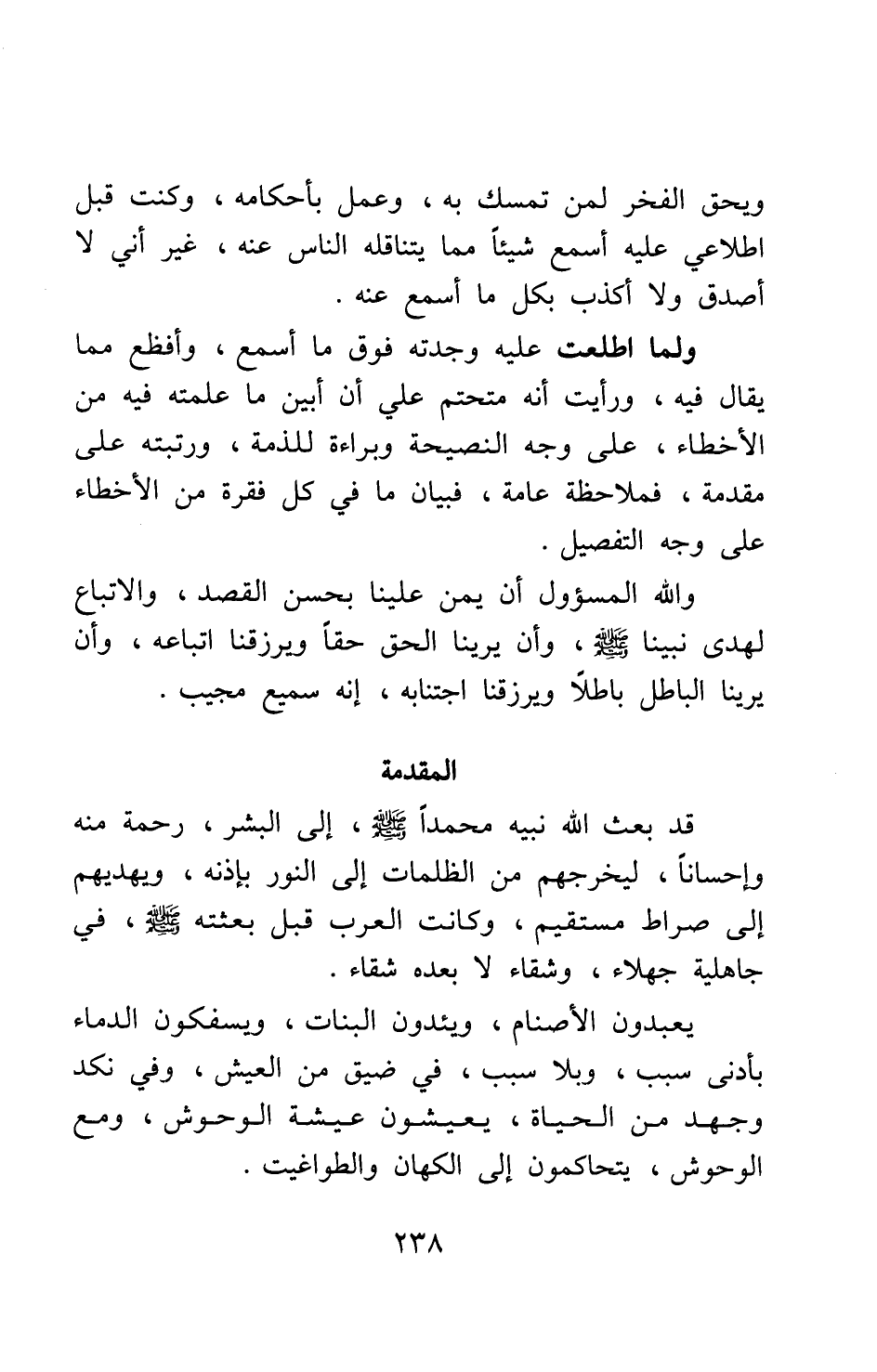 ويحق الفخر لمن تمسك به، وعمل بأحكامه، وكنت قبل اطلاعي عليه أسمع شيئا مما يتناقله الناس عنه، غير أني لا أصدق ولا أكذب بكل ما أسمع عنه. ولما اطلعت عليه وجدته فوقع ما أسمع، وأفظع مما يقال فيه، ورأيت أنه متحتم علي أن أبين ما علمته فيه من الأخطاء، على وجه النصيحة وبراءة الذمة، ورتبته على مقدمة، فملاحظة عامة، فبيان ما في كل فقرة من الأخطاء على وجه التفصيل. والله المسؤول أن يمن علينا بحسن القصد، والاتباع لهدى نبينا صلى الله عليه وسلم، وأن يرينا الحق حقا ويرزقنا اتباعه، وأن يرينا الباطل باطلا ويرزقنا اجتنابه، إنه سميع مجيب.