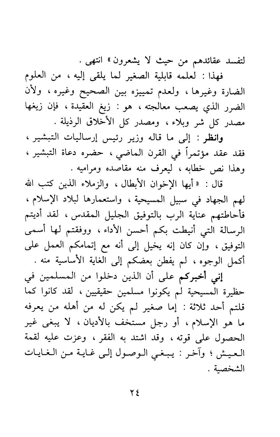وانظر إلى ما قاله وزير رئيس إرساليات التبشير، فقد عقد مؤتمرا في القرن الماضي، حضره دعاة التبشير، وهذا نص خطابه، ليعرف منه مقاصده ومراميه. قال: أيها الإخوان الأبطال، والزملاء الذين كتب الله لهم الجهاد في سبيل المسيحية واستعمارها لبلاد الإسلام؛ فأحاطتهم عناية الرب بالتوفيق الجليل المقدس، لقد أديتم الرسالة التي أنيطت بكم أحسن الأداء، ووفقتم لها أسمى التوفيق، وإن كان إنه يخيل إلي أنه مع إتمامكم العمل على أكمل الوجوه، لم يفطن بعضكم إلى الغاية الأساسية منه. إني أخبركم على أن الذين دخلوا من المسلمين في حظيرة المسيحية لم يكونوا مسلمين حقيقيين؛ لقد كانوا كما قلتم أحد ثلاثة: إما صغير لم يكن له من أهله من يعرفه ما هو الإسلام، أو رجل مستخف بالأديان لا يبغى غير الحصول على قوته، وقد اشتد به الفقر، وعزت عليه لقمة العيش; وآخر: يبغي الوصول إلى غاية من الغايات الشخصية.