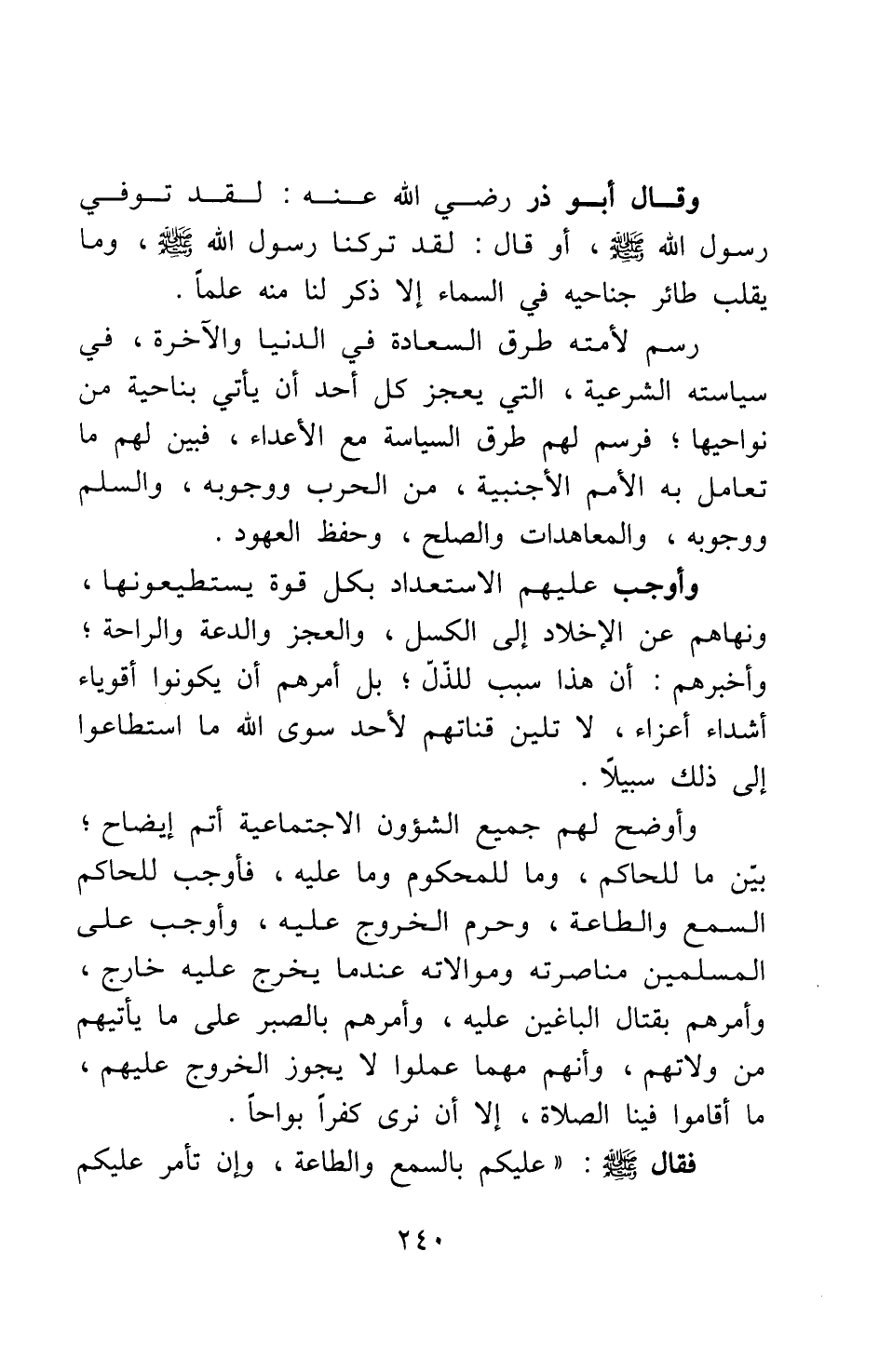 وقال أبو ذر رضي الله عنه "لقد توفي رسول الله صلى الله عليه وسلم، أو قال: لقد تركنا رسول الله صلى الله عليه وسلم وما يقلب طائر جناحيه في السماء إلا ذكر لنا منه علما". رسم لأمته طرق السعادة في الدنيا والآخرة، في سياسته الشرعية، التي يعجز كل أحد أن يأتي بناحية من نواحيها، فرسم لهم طرق السياسة مع الأعداء، فبين لهم ما تعامل به الأمم الأجنبية، من الحرب ووجوبه، والسلم ووجوبه، والمعاهدات والصلح، وحفظ العهود. وأوجب عليهم الاستعداد بكل قوة يستطيعونها، ونهاهم عن الإخلاد إلى الكسل والعجز والدعة والراحة، وأخبرهم أن هذا سبب للذل ; بل أمرهم أن يكونوا أقوياء أشداء أعزاء، لا تلين قناتهم لأحد سوى الله ما استطاعوا إلى ذلك سبيلا. وأوضح لهم جميع الشؤون الاجتماعية أتم إيضاح؛ بين ما للحاكم، وما للمحكوم وما عليه؛ فأوجب للحاكم السمع والطاعة، وحرم الخروج عليه، وأوجب على المسلمين مناصرته وموالاته عندما يخرج عليه خارج؛ وأمرهم بقتال الباغين عليه؛ وأمرهم بالصبر على ما يأتيهم من ولاتهم، وأنهم مهما عملوا لا يجوز الخروج عليهم، ما أقاموا فينا الصلاة، إلا أن نرى كفرا بواحا،
