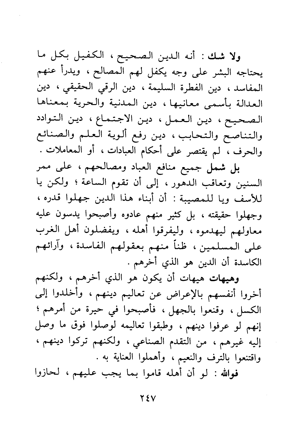 ولا شك أنه الدين الصحيح، الكفيل بكل ما يحتاجه البشر على وجه يكفل لهم المصالح، ويدرأ عنهم المفاسد، دين الفطرة السليمة، دين الرقي الحقيقي، دين العدالة بأسمى معانيها، دين المدنية والحرية بمعناها الصحيح، دين العمل، دين الاجتماع، دين التوادد والتناصح والتحابب، دين رفع ألوية العلم والصنائع والحرف. لم يقتصر على أحكام العبادات، أو المعاملات، بل شمل جميع منافع العباد ومصالحهم، على ممر السنين وتعاقب الدهور، إلى أن تقوم الساعة. ولكن يا للأسف ويا للمصيبة! أن أبناء هذا الدين جهلوا قدره، وجهلوا حقيقته؛ بل كثير منهم عادوه وأصبحوا يدسون عليه معاولهم ليهدموه، وليفرقوا أهله، ويفضلون أهل الغرب على المسلمين، ظنا منهم بعقولهم الفاسدة وآرائهم الكاسدة أن الدين هو الذي أخرهم، وهيهات هيهات أن يكون هو الذي أخرهم، ولكنهم أخروا أنفسهم بالإعراض عن تعاليم دينهم، وأخلدوا إلى الكسل، وقنعوا بالجهل، فأصبحوا في حيرة من أمرهم. إنهم لو عرفوا دينهم، وطبقوا تعاليمه لوصلوا فوق ما وصل إليه غيرهم، من التقدم الصناعي؛ ولكنهم تركوا دينهم، واقتنعوا بالترف والنعيم، وأهملوا العناية به.