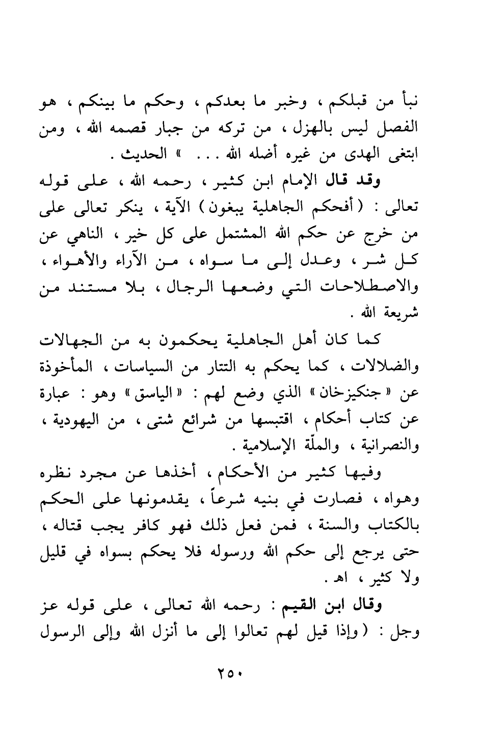 وقد قال الإمام ابن كثير رحمه الله، على قوله تعالى: {أَفَحُكْمَ الْجَاهِلِيَّةِ يَبْغُونَ} [سورة المائدة آية: 50] الآية: ينكر تعالى على من خرج عن حكم الله المشتمل على كل خير، الناهي عن كل شر، وعدل إلى ما سواه من الآراء والأهواء، والاصطلاحات التي وضعها الرجال، بلا مستند من شريعة الله، كما كان أهل الجاهلية يحكمون به من الجهالات والضلالات، كما يحكم به التتار من السياسات المأخوذة عن "جنكيزخان" الذي وضع لهم: "الياسق" وهو: عبارة عن كتاب أحكام، اقتبسها من شرائع شتى، من اليهودية، والنصرانية، والملة الإسلامية، وفيها كثير من الأحكام، أخذها عن مجرد نظره وهواه، فصارت في بنيه شرعا، يقدمونها على الحكم بالكتاب والسنة؛ فمن فعل ذلك فهو كافر يجب قتاله، حتى يرجع إلى حكم الله ورسوله فلا يحكم بسواه في قليل ولا كثير، ا?.