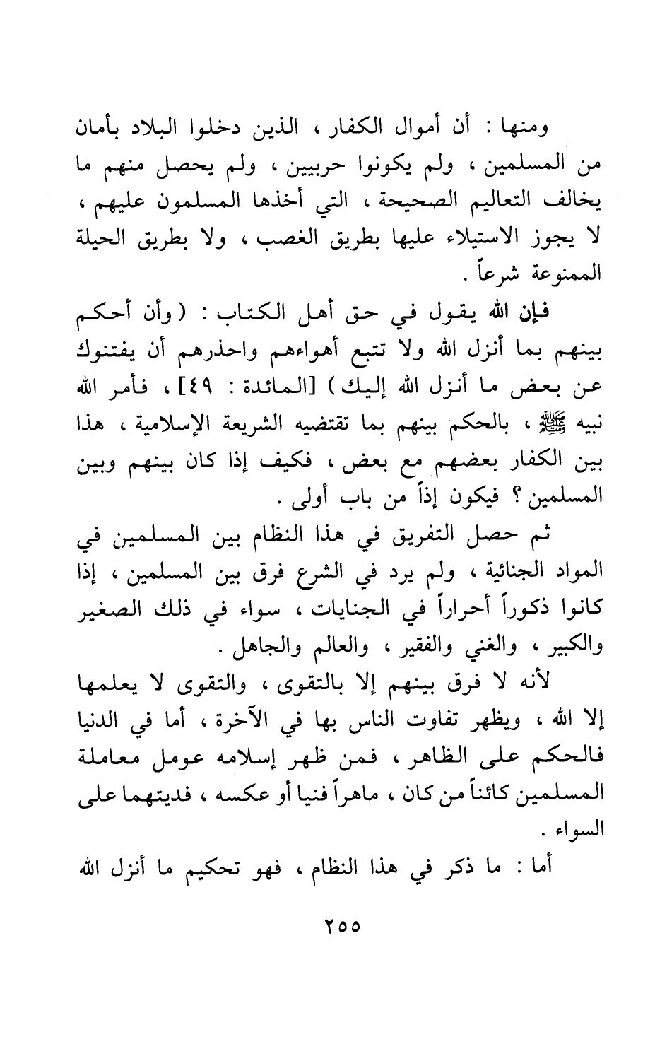ومنها: أن أموال الكفار الذين دخلوا البلاد بأمان من المسلمين، ولم يكونوا حربيين، ولم يحصل منهم ما يخالف التعاليم الصحيحة التي أخذها المسلمون عليهم، لا يجوز الاستيلاء عليها بطريق الغصب، ولا بطريق الحيلة الممنوعة شرعا. فإن الله يقول في حق أهل الكتاب: {وَأَنِ احْكُمْ بَيْنَهُمْ بِمَا أَنْزَلَ اللَّهُ وَلا تَتَّبِعْ أَهْوَاءَهُمْ وَاحْذَرْهُمْ أَنْ يَفْتِنُوكَ عَنْ بَعْضِ مَا أَنْزَلَ اللَّهُ إِلَيْكَ} [سورة المائدة آية: 49] ، فأمر الله نبيه صلى الله عليه وسلم بالحكم بينهم بما تقتضيه الشريعة الإسلامية؛ هذا بين الكفار بعضهم مع بعض، فكيف إذا كان بينهم وبين المسلمين؟ فيكون إذاً من باب أولى. ثم حصل التفريق في هذا النظام بين المسلمين في المواد الجنائية، ولم يرد في الشرع فرق بين المسلمين، إذا كانوا ذكورا أحرارا في الجنايات، سواء في ذلك الصغير والكبير، والغني والفقير، والعالم والجاهل؛ لأنه لا فرق بينهم إلا بالتقوى، والتقوى لا يعلمها إلا الله، ويظهر تفاوت الناس بها في الآخرة، أما في الدنيا فالحكم على الظاهر، فمن ظهر إسلامه عومل معاملة المسلمين كائنا من كان، ماهرا فنيا أو عكسه، فديتهما على السواء.