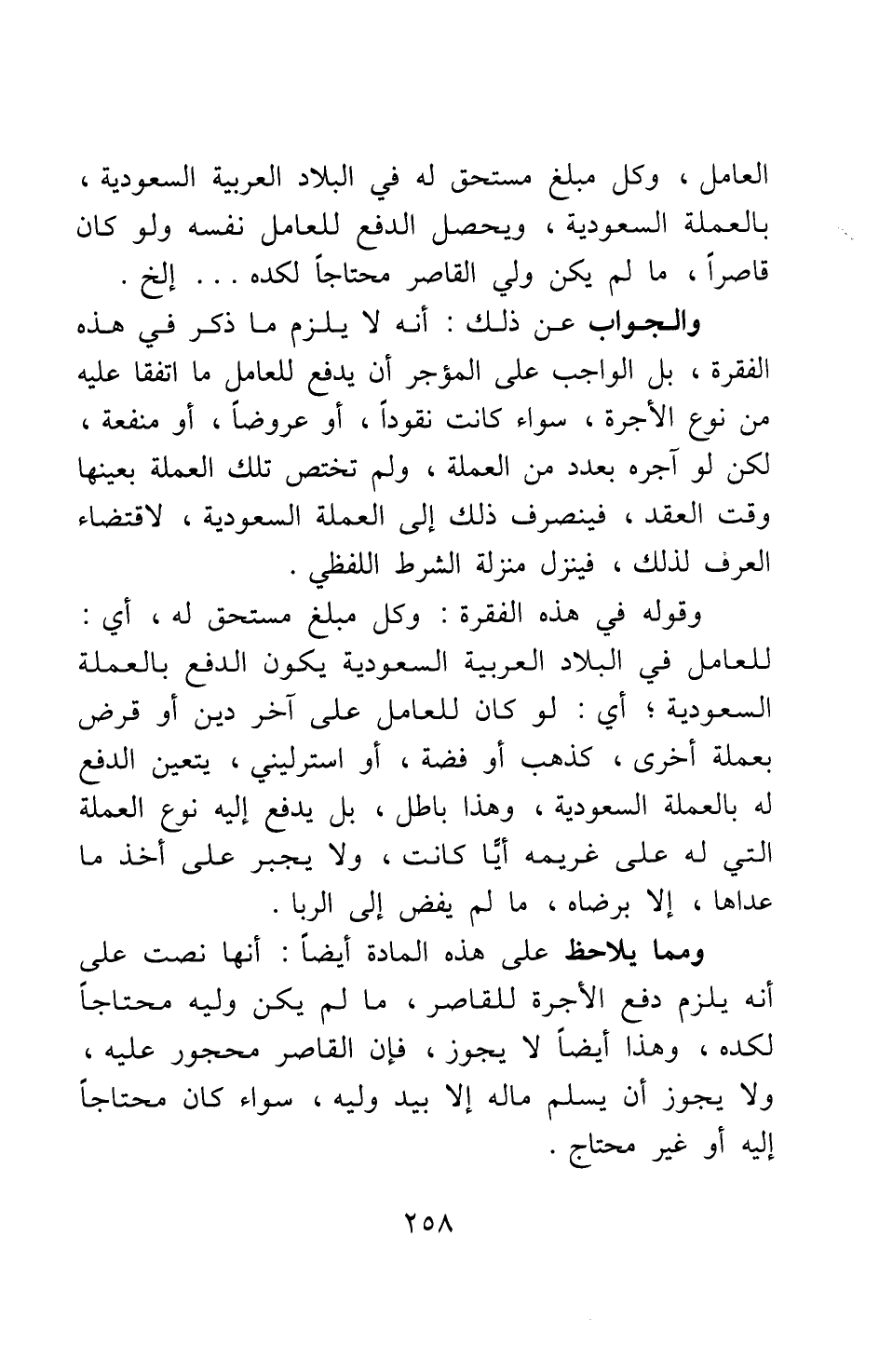 العامل وكل مبلغ مستحق له في البلاد العربية السعودية، بالعملة السعودية، ويحصل الدفع للعامل نفسه ولو كان قاصرا، ما لم يكن ولي القاصر محتاجا لكده ... إلخ. والجواب عن ذلك: أنه لا يلزم ما ذكر في هذه الفقرة، بل الواجب على المؤجر أن يدفع للعامل ما اتفقا عليه من نوع الأجرة، سواء كانت نقودا، أو عروضا، أو منفعة، لكن لو أجره بعدد من العملة، ولم تختص تلك العملة بعينها وقت العقد، فينصرف ذلك إلى العملة السعودية، لاقتضاء العرف لذلك، فينْزل منْزلة الشرط اللفظي.