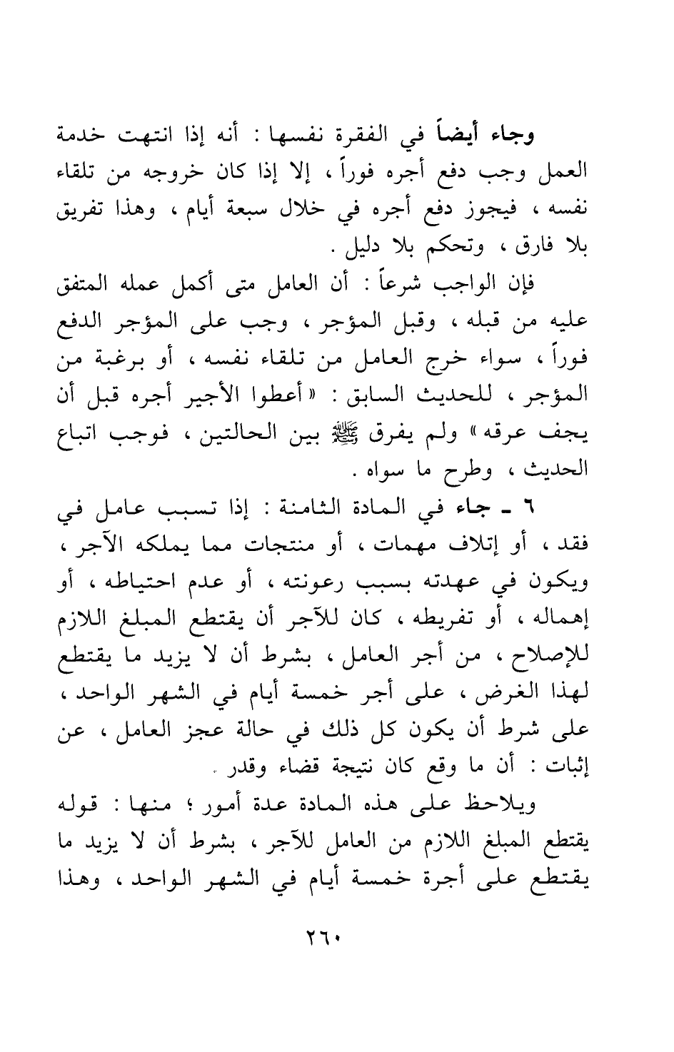 وجاء أيضا في الفقرة نفسها: أنه إذا انتهت خدمة العمل وجب دفع أجره فورا، إلا إذا كان خروجه من تلقاء نفسه، فيجوز دفع أجره في خلال سبعة أيام، وهذا تفريق بلا فارق، وتحكم بلا دليل. فإن الواجب شرعا أن العامل متى أكمل عمله المتفق عليه من قبله، وقبل المؤجر، وجب على المؤجر الدفع فورا، سواء خرج العامل من تلقاء نفسه، أو برغبة من المؤجر، للحديث السابق: "أعطوا الأجير أجره قبل أن يجف عرقه" 1 ولم يفرق صلى الله عليه وسلم بين الحالتين، فوجب اتباع الحديث، وطرح ما سواه.