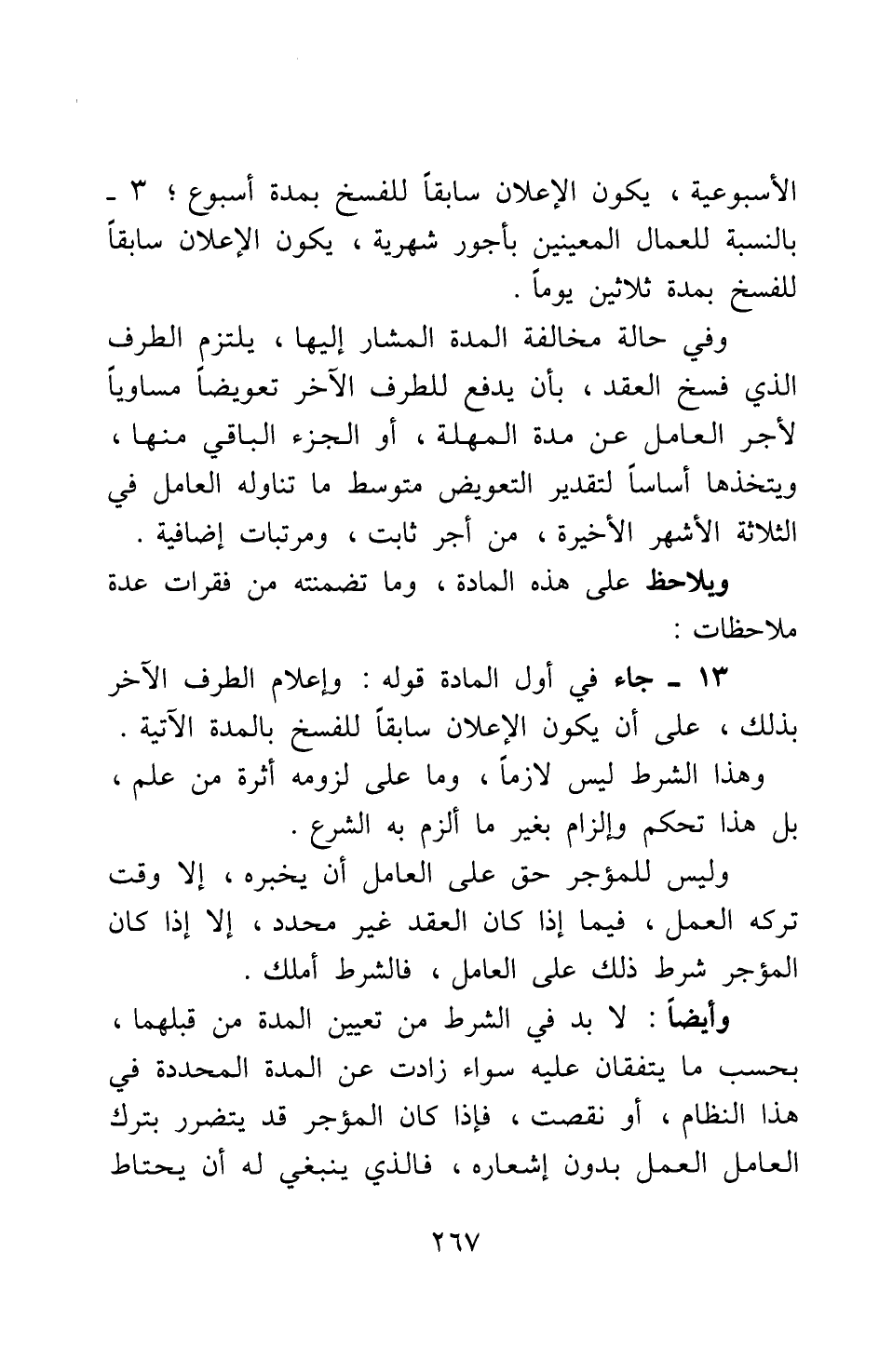 13- جاء في أول المادة قوله: وإعلام الطرف الآخر بذلك، على أن يكون الإعلان سابقا للفسخ بالمدة الآتية. وهذا الشرط ليس لازما، وما على لزومه أثرة من علم؛ بل هذا تحكم وإلزام بغير ما ألزم به الشرع.