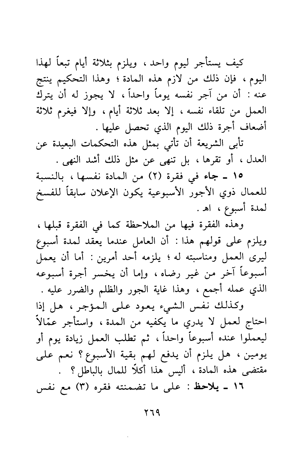 15- جاء في فقرة من المادة نفسها، بالنسبة للعمال ذوي الأجور الأسبوعية يكون الإعلان سابقا للفسخ لمدة أسبوع ا?. وهذه الفقرة فيها من الملاحظة كما في الفقرة قبلها، ويلزم على قولهم هذا: أن العامل عندما يعقد لمدة أسبوع ليرى العمل ومناسبته له، يلزمه أحد أمرين: أما أن يعمل أسبوعا آخر من غير رضاه، وإما أن يخسر أجرة أسبوعه الذي عمله أجمع؛ وهذا غاية الجور والظلم والضرر عليه. وكذلك نفس الشيء يعود على المؤجر، هل إذا احتاج لعمل لا يدري ما يكفيه من المدة، واستأجر عمالا ليعملوا عنده أسبوعا واحدا، ثم تطلب العمل زيادة يوم أو يومين، هل يلزم أن يدفع لهم بقية الأسبوع؟ نعم على مقتضى هذه المادة، أليس هذا أكلا للمال بالباطل؟